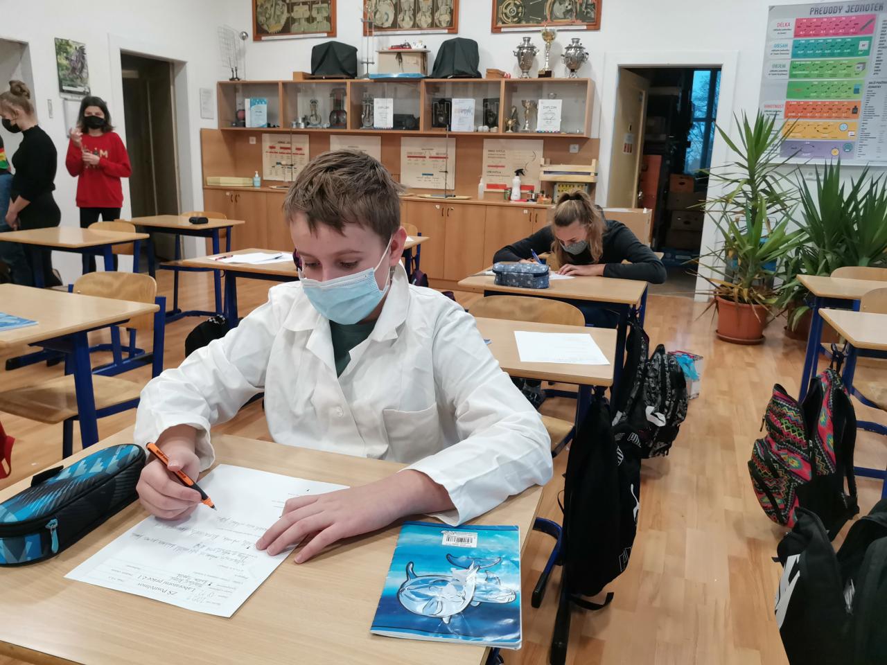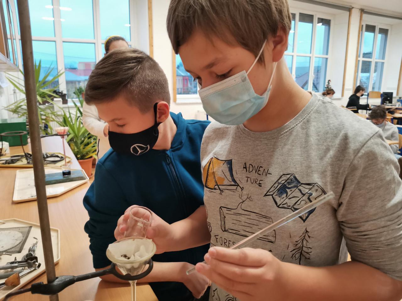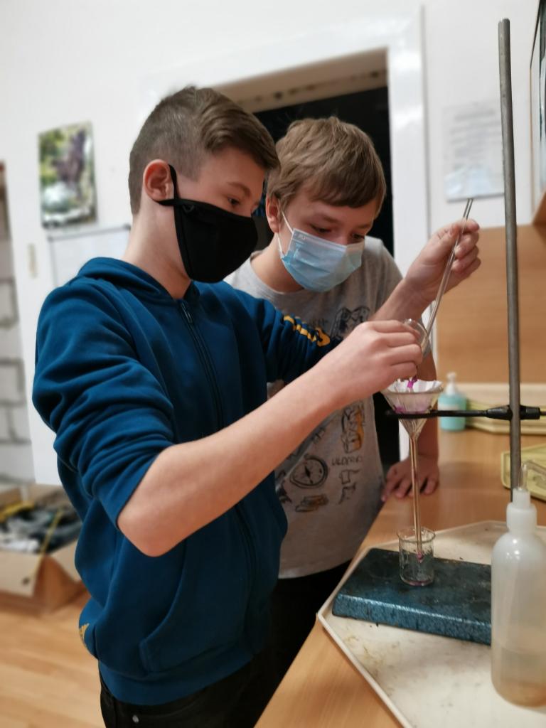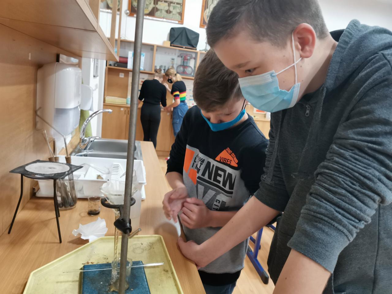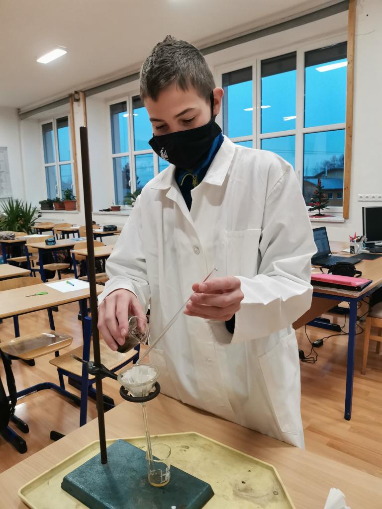 Přece jen se něco stihlo! Ještě před nástupem na distanční výuku žáci 7.A zvládli provést laboratorní práci zaměřenou na oddělování složek směsí pomocí filtrace. V rámci několika hodin si žáci názornými postupy propojili již probrané učivo, a tak pro ně bude učební látka určitě lépe zapamatovatelná a mohou na ni navázat, až to zase situace dovolí...