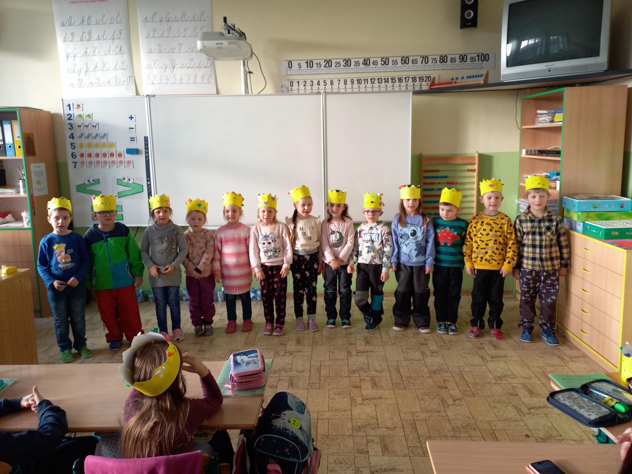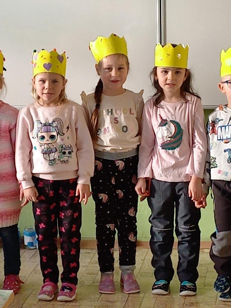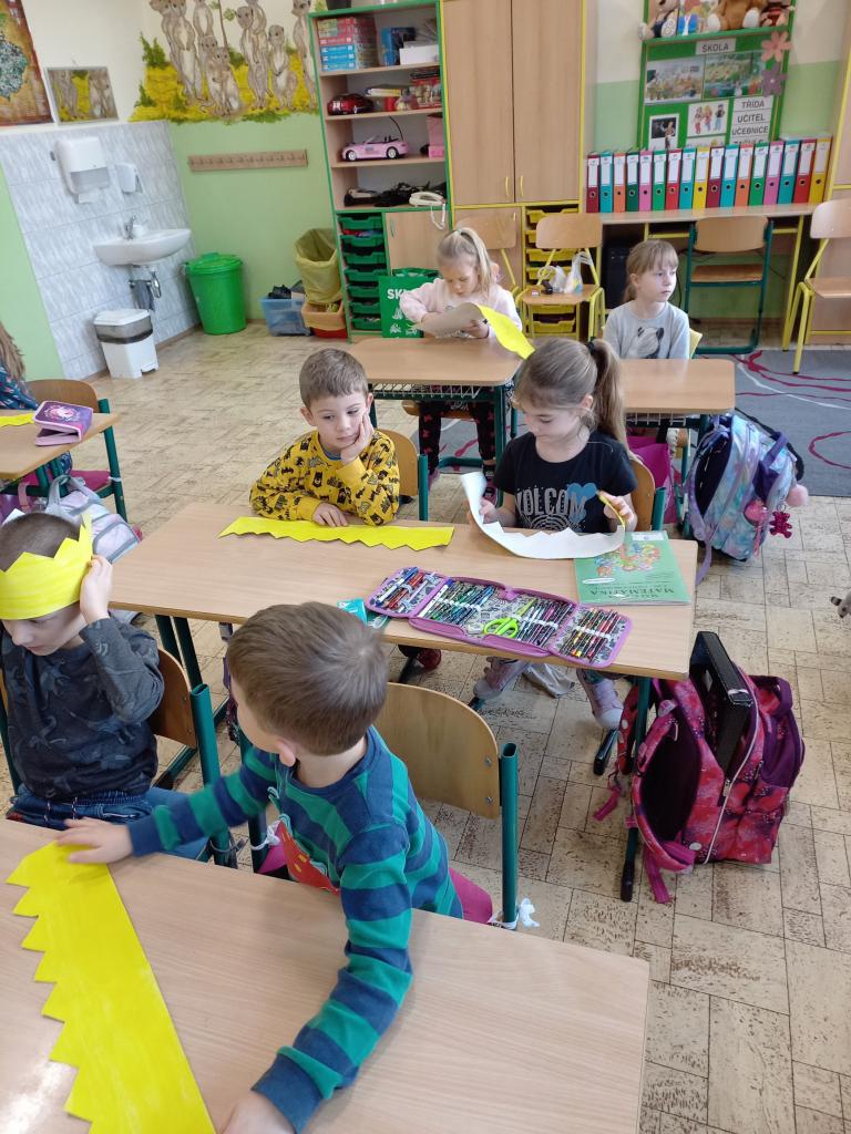 4. ledna navštívila třída Zajíčků z mateřské školy děti z 1. A. Vzhledem k blížícímu se svátku Tří králů si předškoláčci za pomoci učitelek vyrobili papírové koruny, které si krásně nazdobili. Prvňáčkům přednesli básničku a při odchodu zazpívali to známé “My tři králové jdeme k vám ...” Svými korunkami se přišli také pochlubit za třeťáky a jejich třídní učitelkou. Proč asi? Někteří totiž právě do téhle třídy a k této paní učitelce 1. září 2023 nastoupí ...