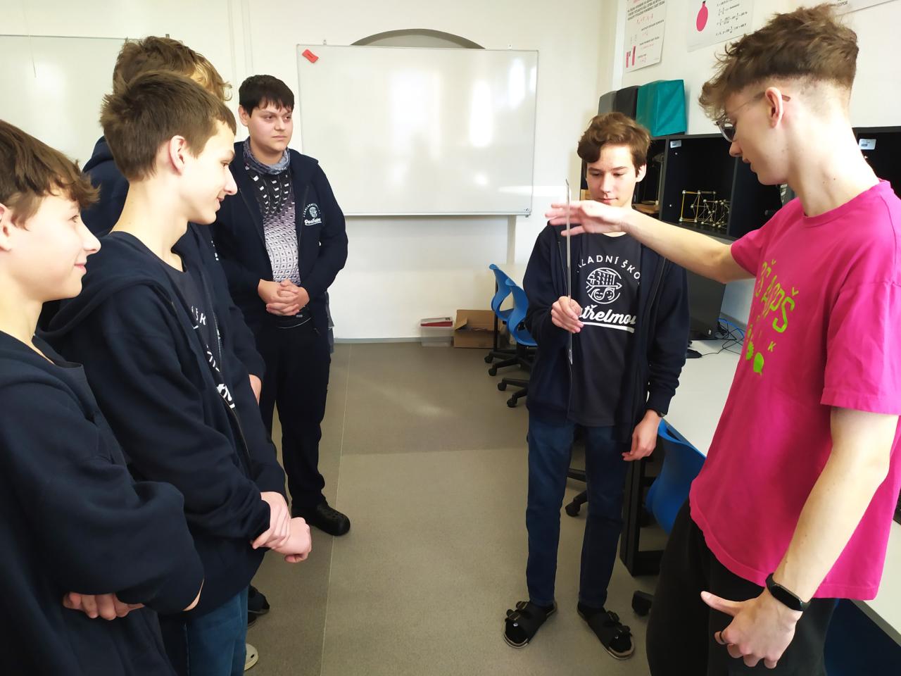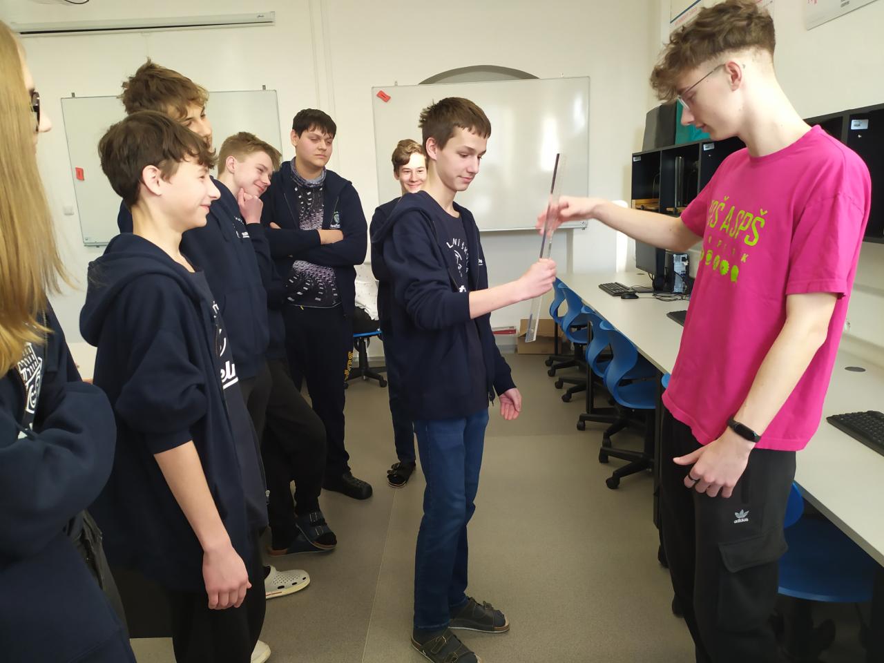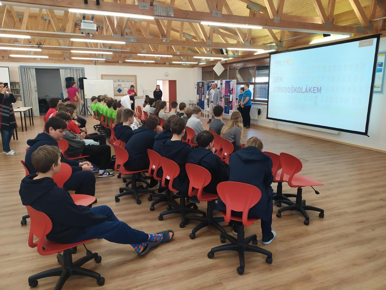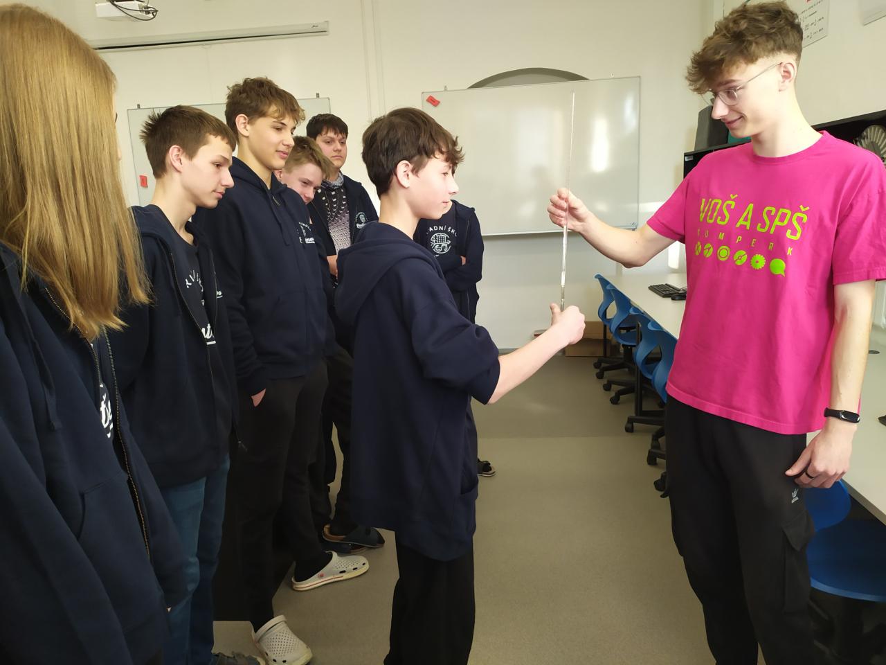 V úterý 30.1. 2024 se našich 9 deváťáků zúčastnilo již tradičního soutěžního dne pro žáky základních škol nazvaný „Den středoškolákem“. Žáci strávili jeden vyučovací den na VOŠ a SPŠ Šumperk, kde v roli učitelů vystupovali studenti střední školy. Mezi obory, které si budoucí středoškoláci vyzkoušeli, byla elektrotechnika, strojírenství, informační technologie a technické lyceum. Praktické zkušenosti pak nabývali na pracovištích s názvy Zuřivý reportér, Kdo modeluje, nezlobí, Posviť si na to a Zdatný fyzik. Šlo o velice zajímavou a zdařilou akci!
