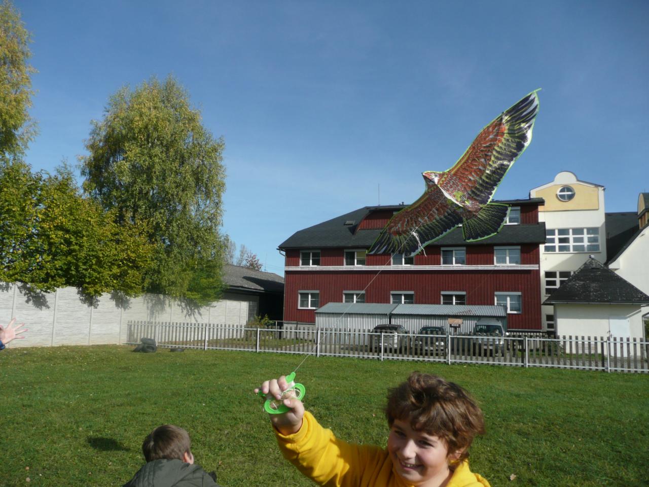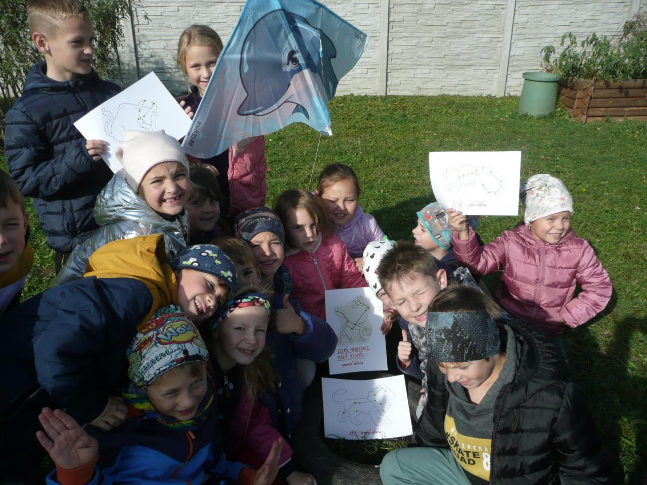 Krásný slunečný podzim umožnil dětem ze školní družiny spoustu pohybu a nejrůznějších aktivit na školní zahradě. Při tradiční soutěživé Drakiádě letošní účastníci propojili běh, zručnost i smyslové vnímání. I. oddělení družiny provázalo akci se svojí celoroční hrou „Vzhůru ke hvězdám“. Jejich drak s obrázkem zvířecího souhvězdí Delfína vzlétl k nebesům a po splnění zadaných úkolů vždy bezpečně přistál na planetě Zemi. Děti z II. oddělení si mimo různorodé soutěžení vyrobily papírové dráčky a vyzdobily s nimi družinu. No a ti nejstarší přivítali především nevšední pohyb a zábavné odpoledne.