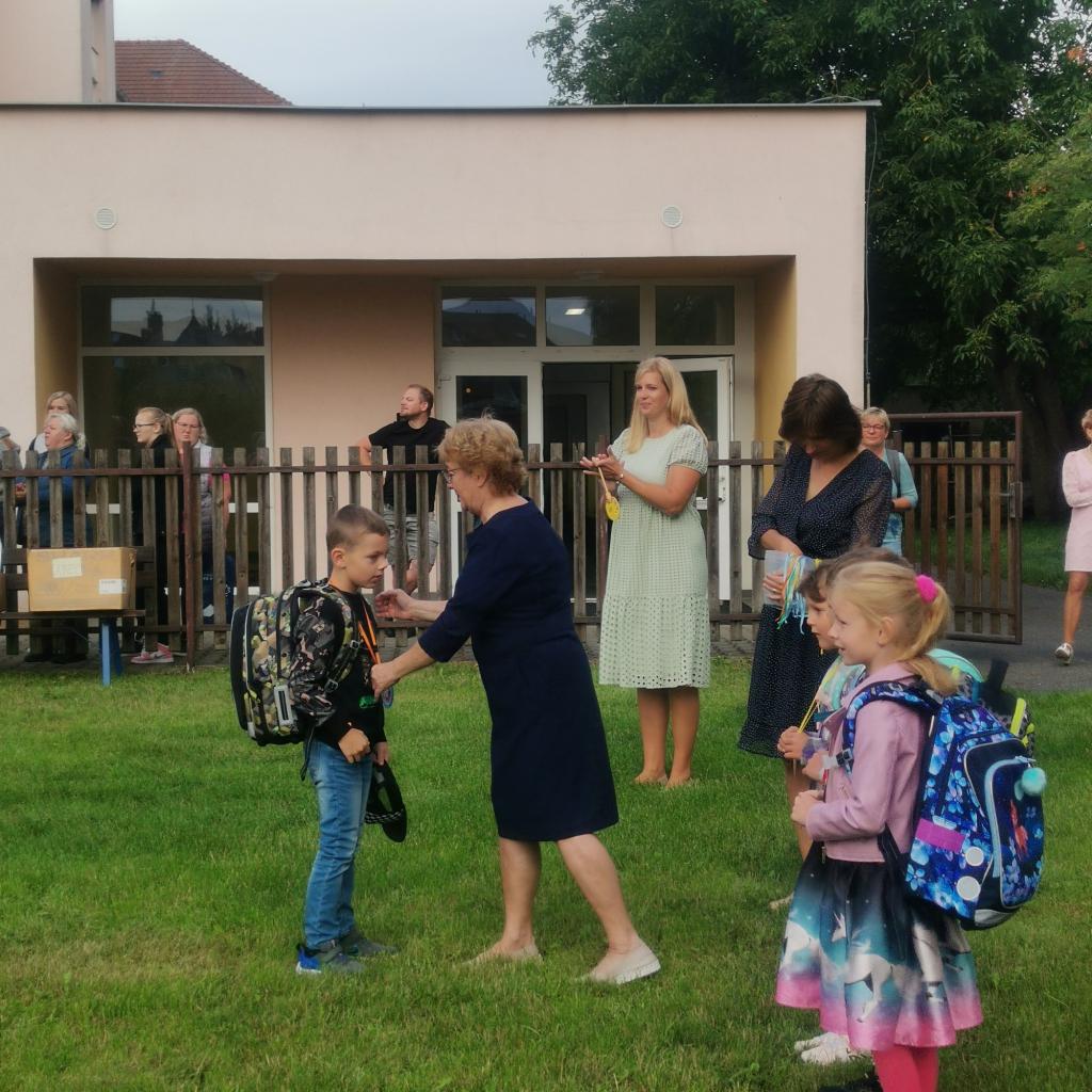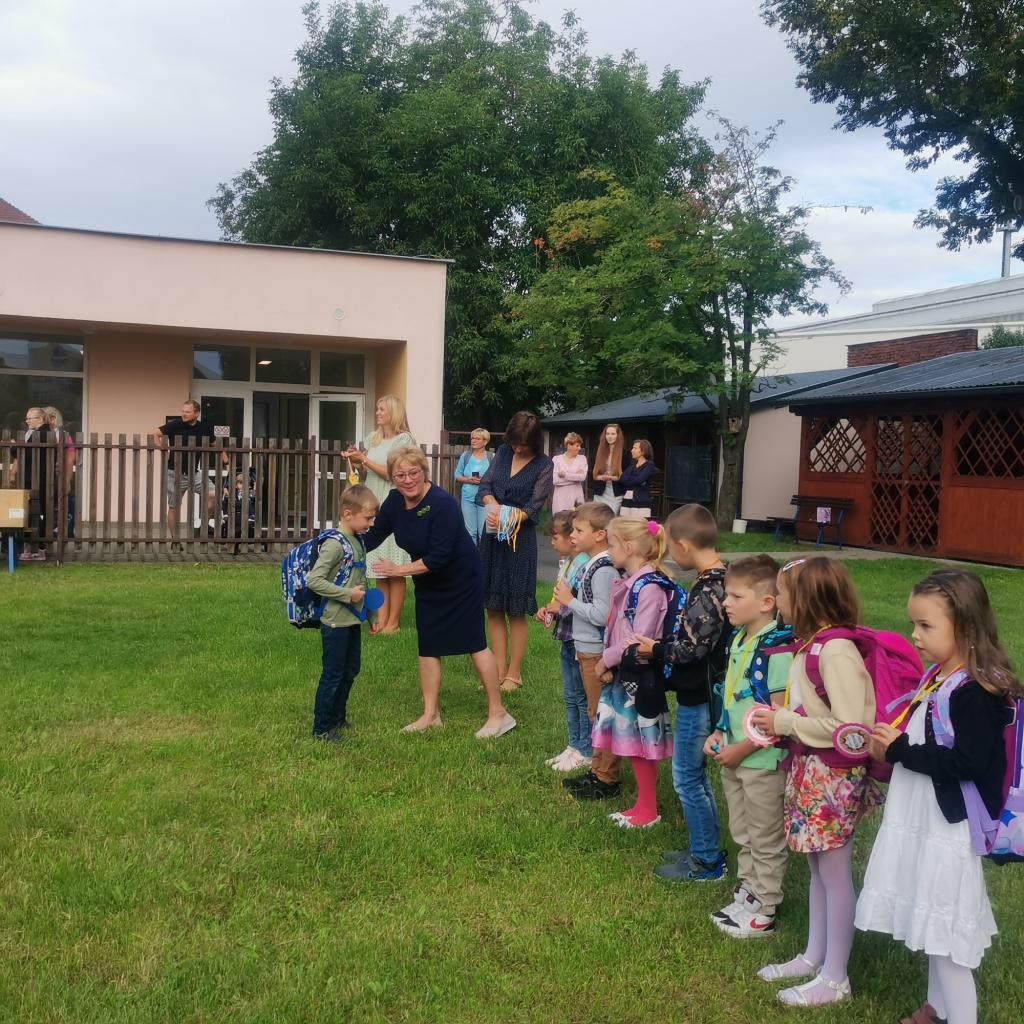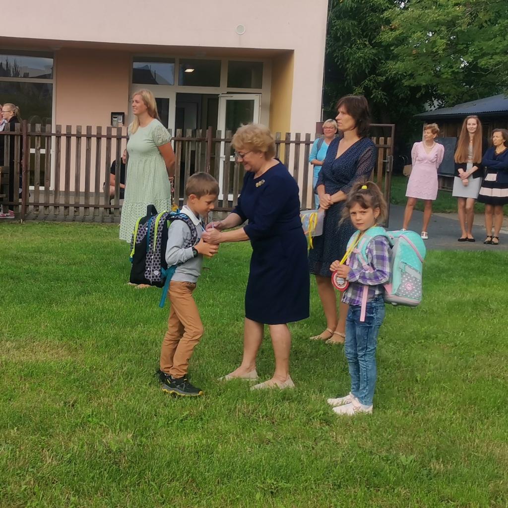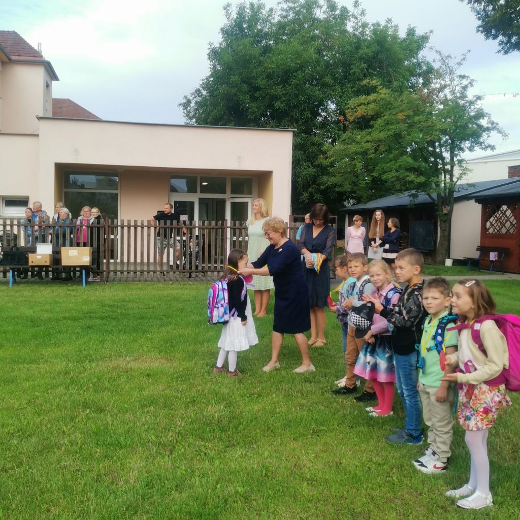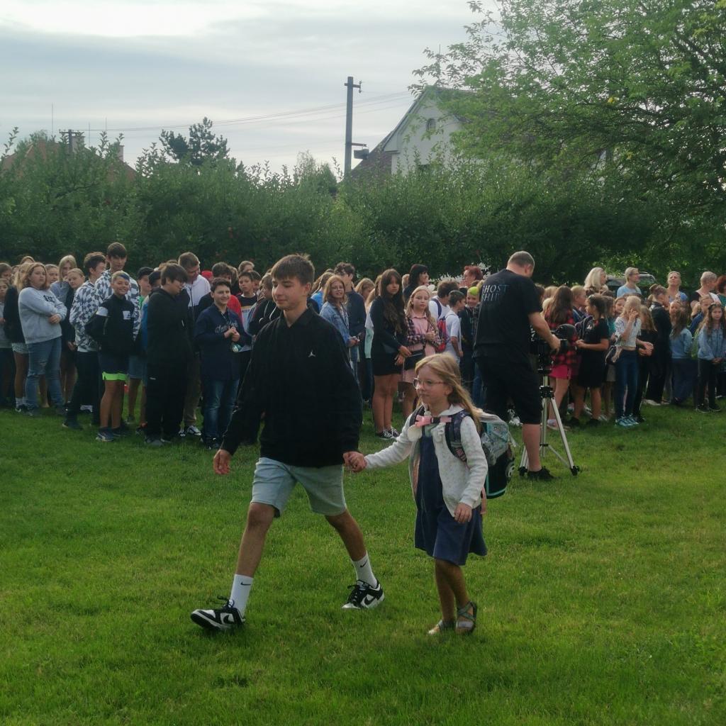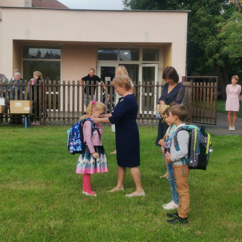 První školní den přivítal žáky krásným slunečným počasím a vypadalo to, že se někteří do školy i těší ... Pro prvňáčky si před hlavní vchod přišly třídní učitelky Iveta Petríková (1.A) a Klára Mičundová (1.B) a na školní zahradě si je seřadily tak, aby je mohli pyšní a dojatí rodiče i prarodiče sledovat při jejich prvních krůčcích za vzděláním ... Po projevu pana ředitele se každého prvňáčka ujal někdo z těch nejstarších, deváťáků, a dovedl ho k paní učitelce. Na uvítanou dostalo 36 dětí medaili a po odchodu do třídy i hezký dáreček.