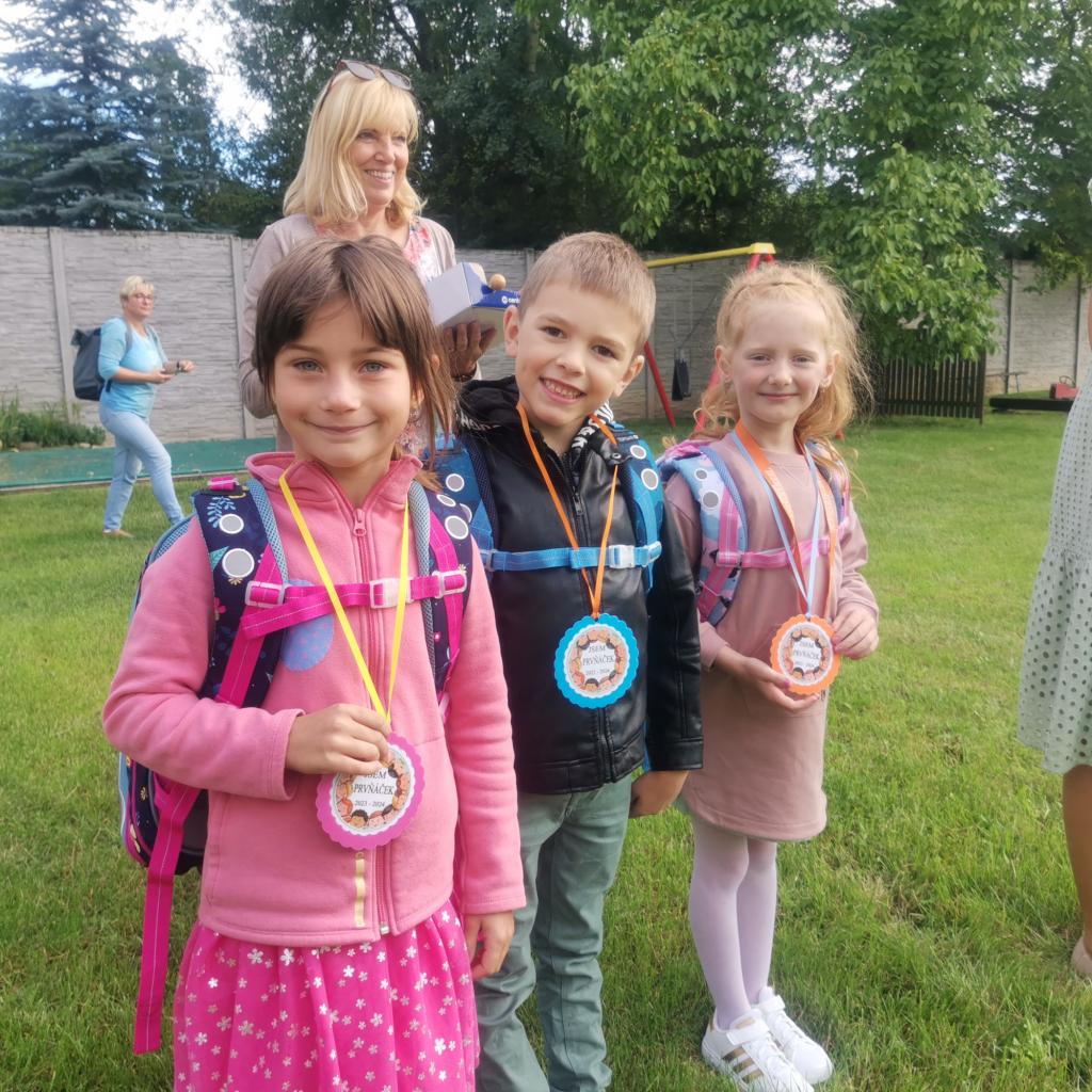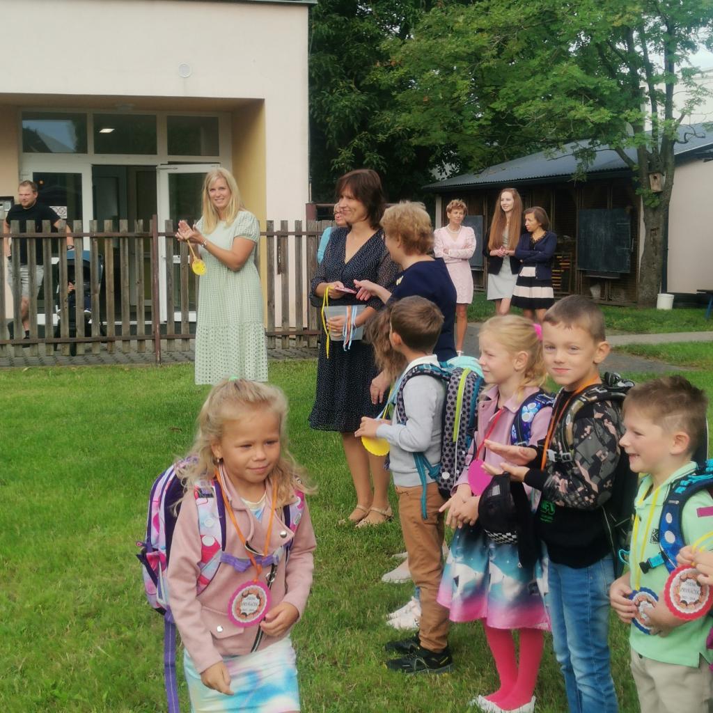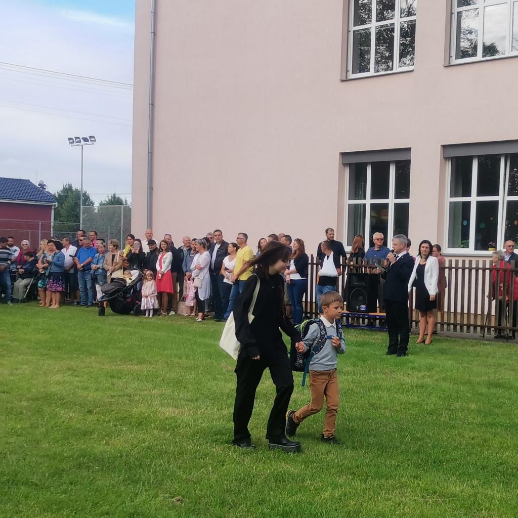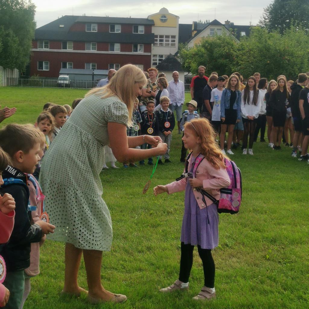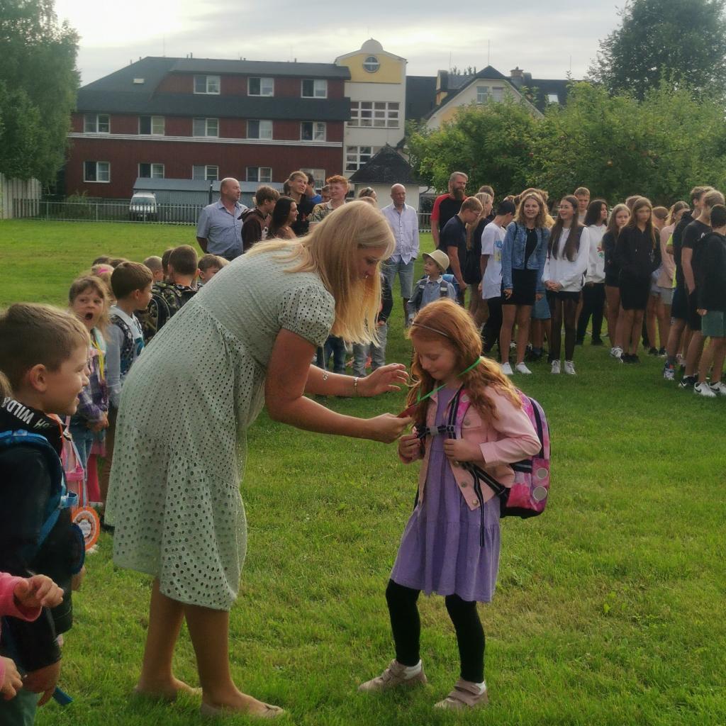 První školní den přivítal žáky krásným slunečným počasím a vypadalo to, že se někteří do školy i těší ... Pro prvňáčky si před hlavní vchod přišly třídní učitelky Iveta Petríková (1.A) a Klára Mičundová (1.B) a na školní zahradě si je seřadily tak, aby je mohli pyšní a dojatí rodiče i prarodiče sledovat při jejich prvních krůčcích za vzděláním ... Po projevu pana ředitele se každého prvňáčka ujal někdo z těch nejstarších, deváťáků, a dovedl ho k paní učitelce. Na uvítanou dostalo 36 dětí medaili a po odchodu do třídy i hezký dáreček.
