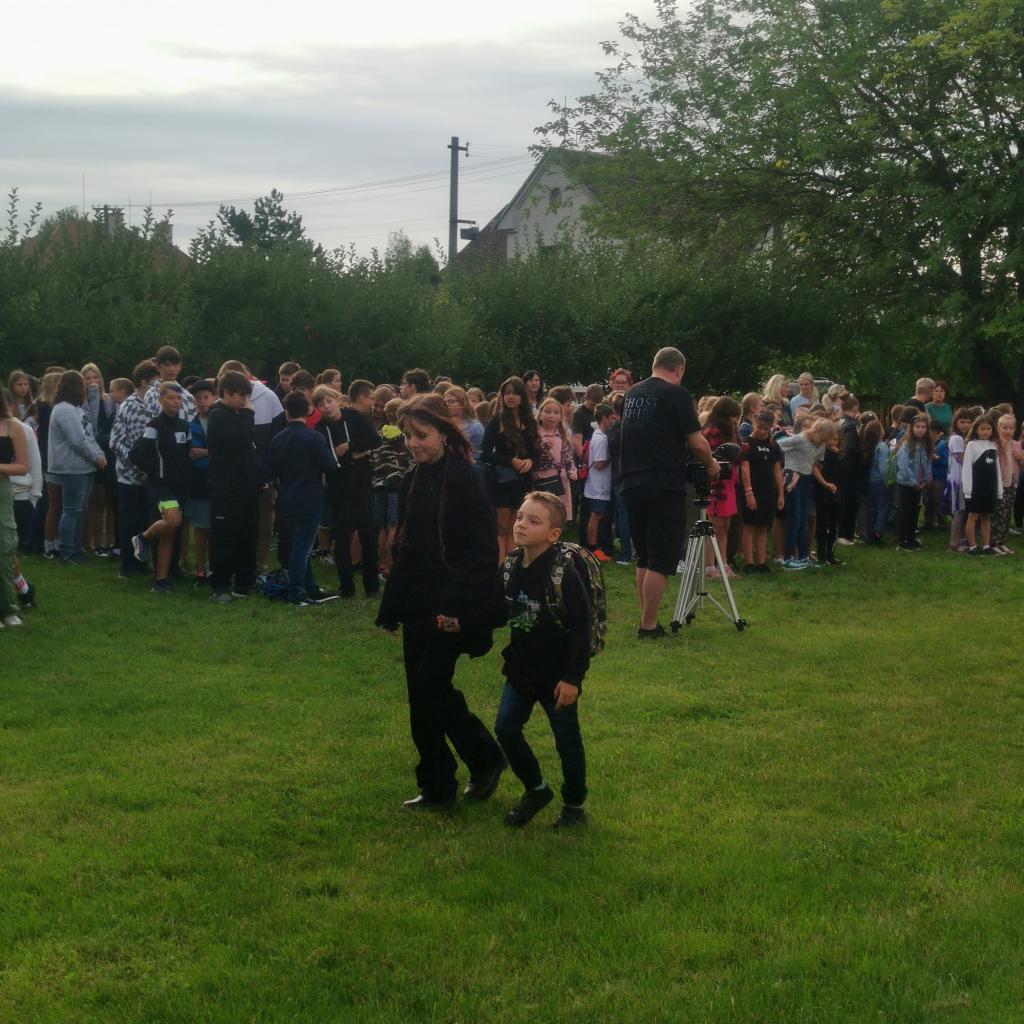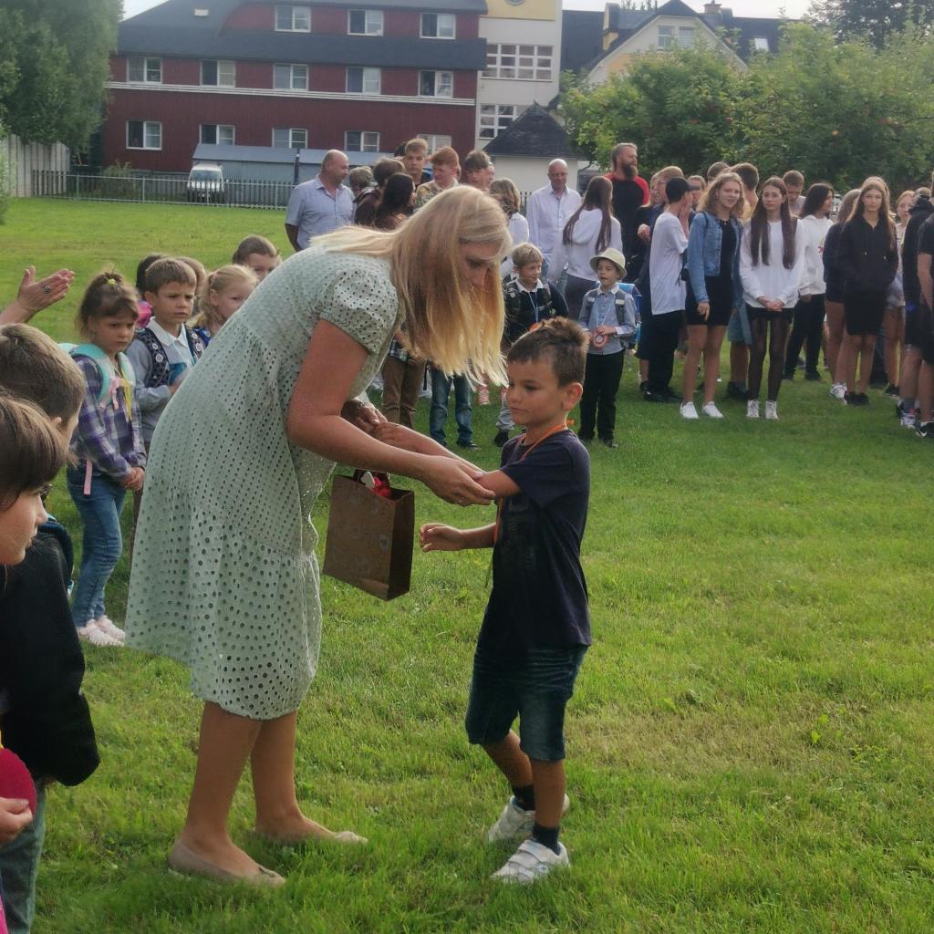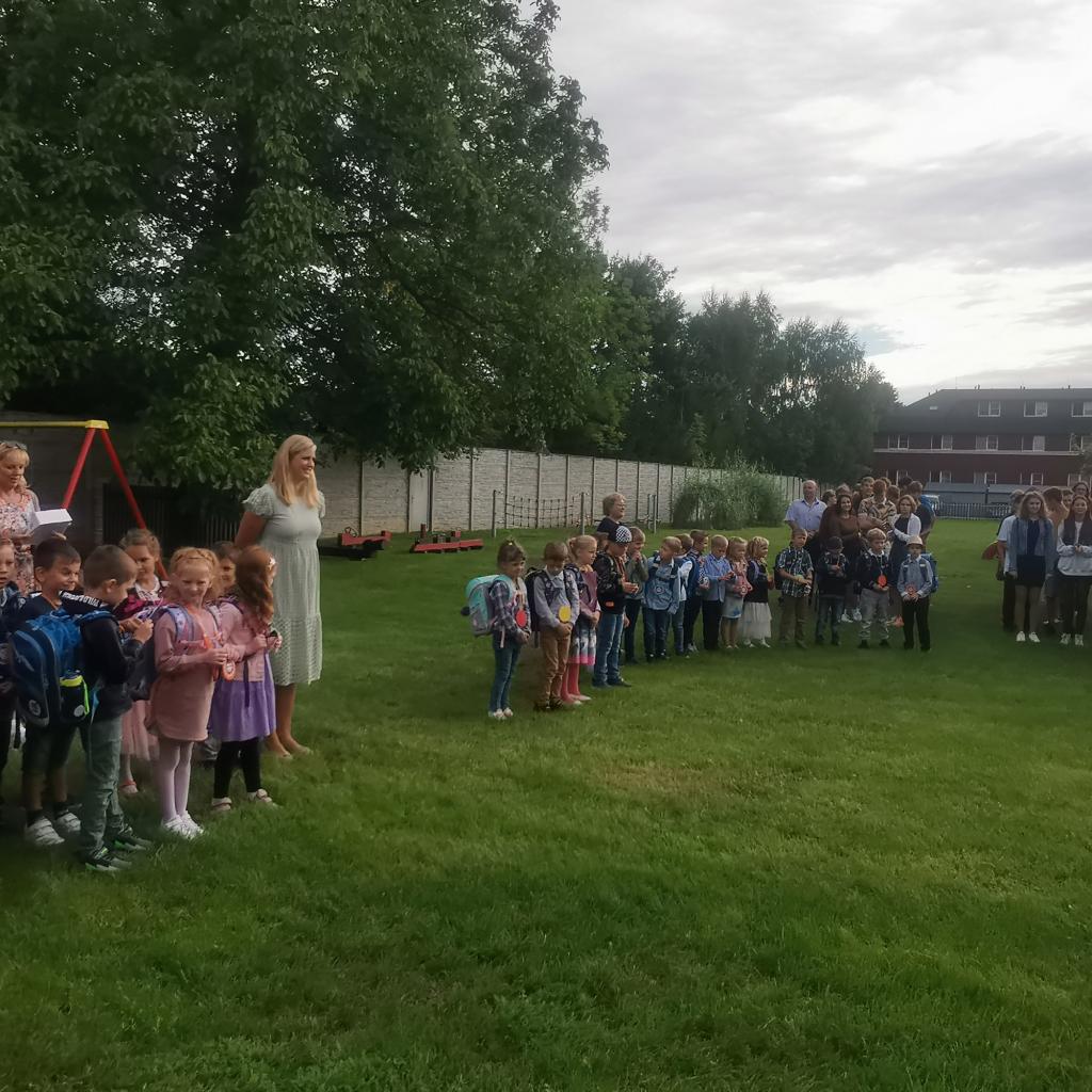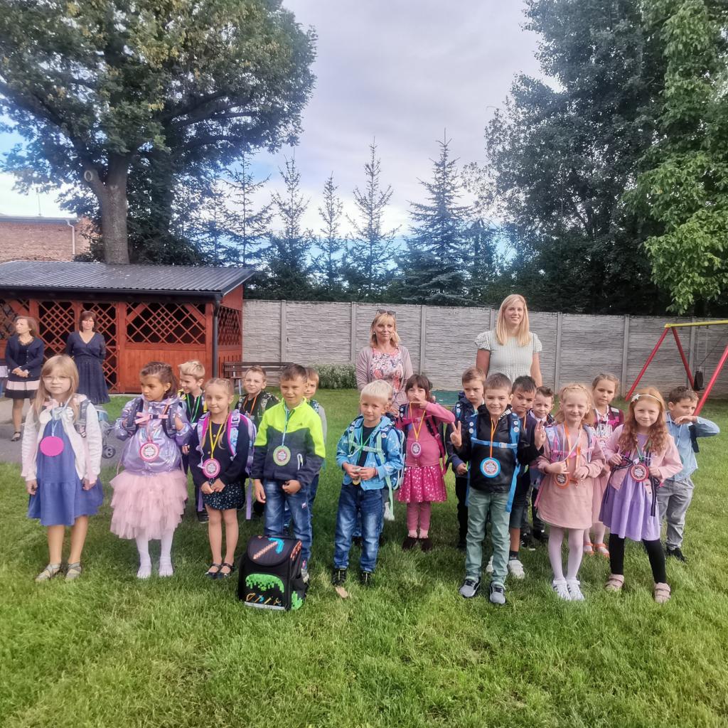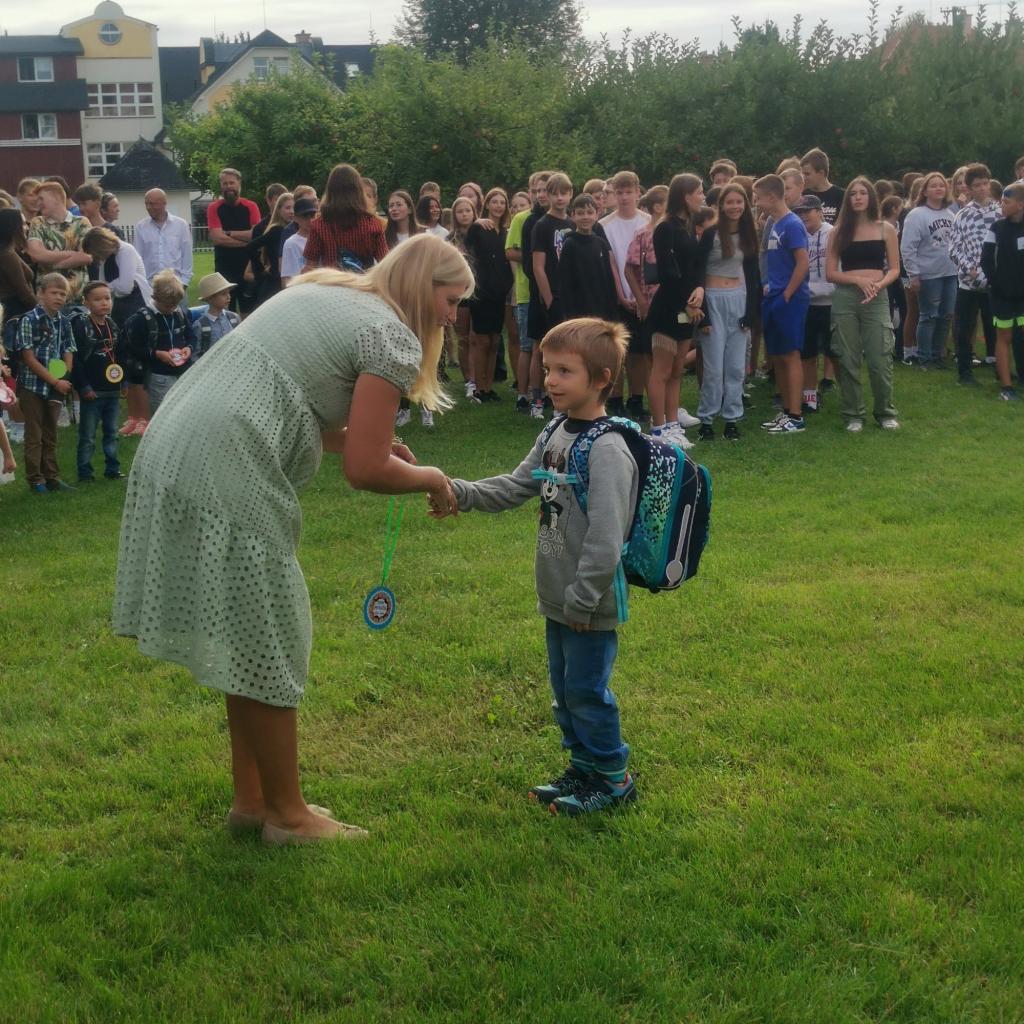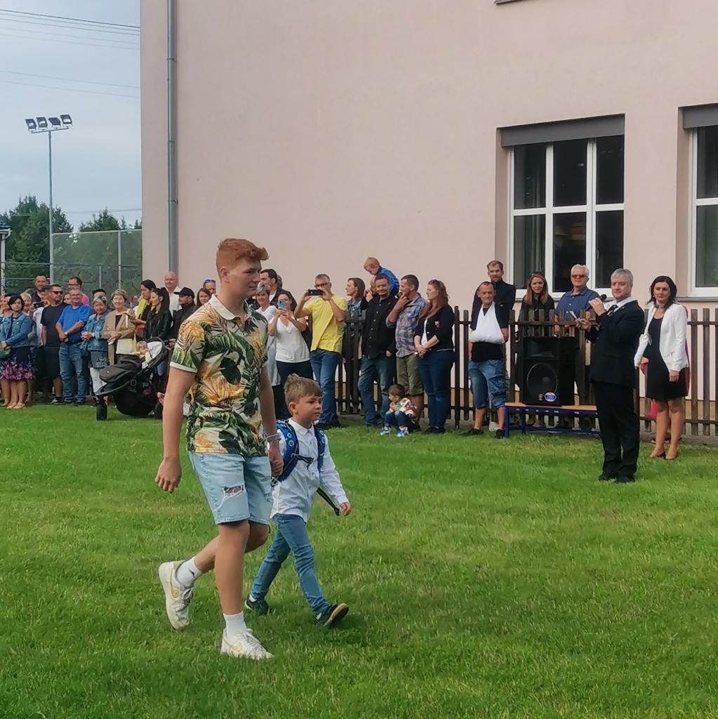 První školní den přivítal žáky krásným slunečným počasím a vypadalo to, že se někteří do školy i těší ... Pro prvňáčky si před hlavní vchod přišly třídní učitelky Iveta Petríková (1.A) a Klára Mičundová (1.B) a na školní zahradě si je seřadily tak, aby je mohli pyšní a dojatí rodiče i prarodiče sledovat při jejich prvních krůčcích za vzděláním ... Po projevu pana ředitele se každého prvňáčka ujal někdo z těch nejstarších, deváťáků, a dovedl ho k paní učitelce. Na uvítanou dostalo 36 dětí medaili a po odchodu do třídy i hezký dáreček.