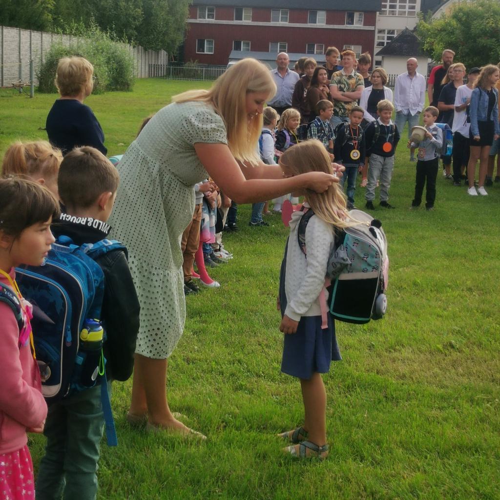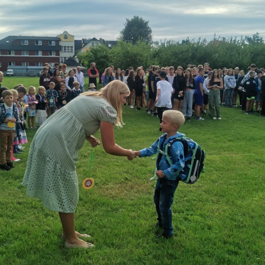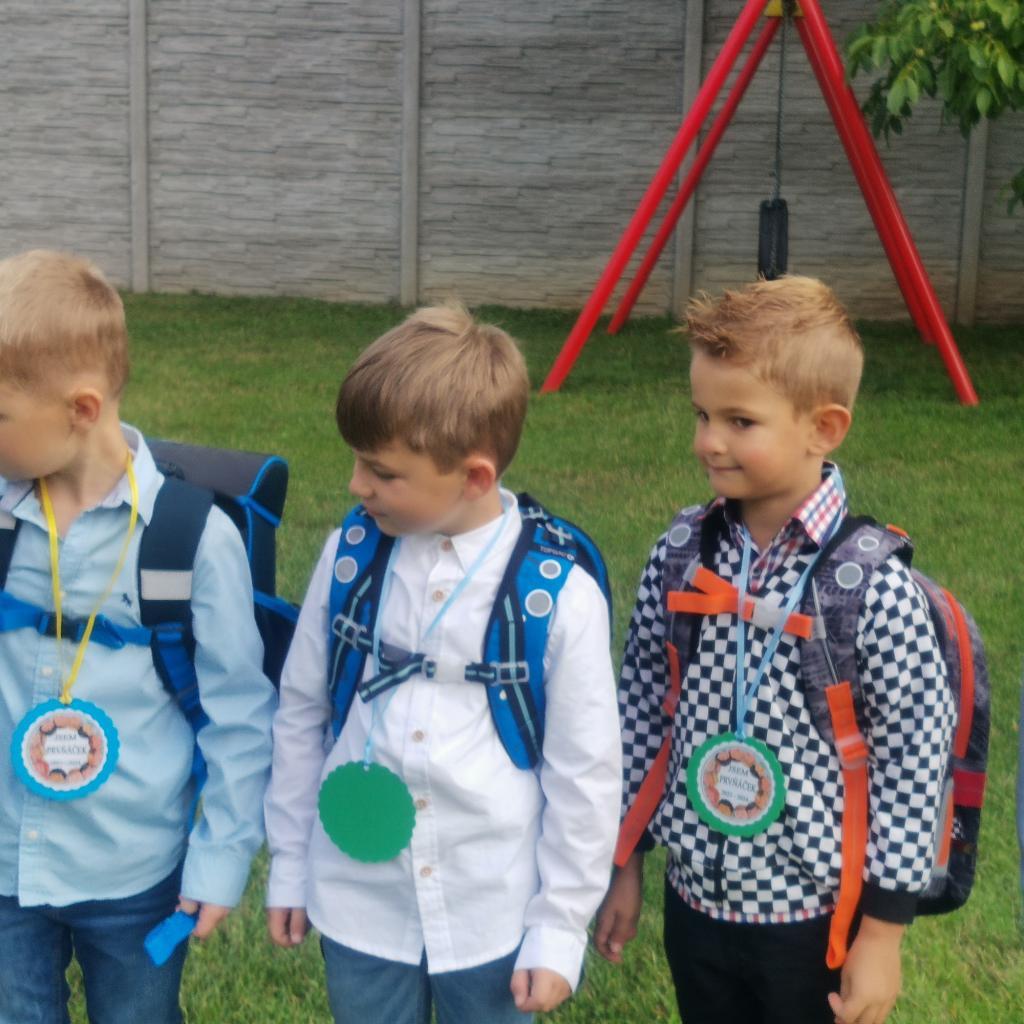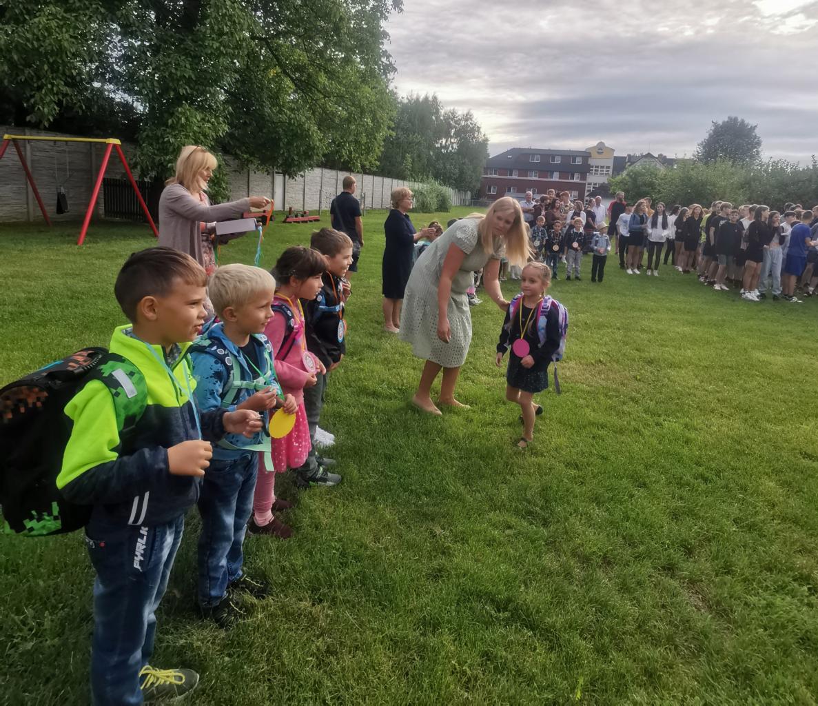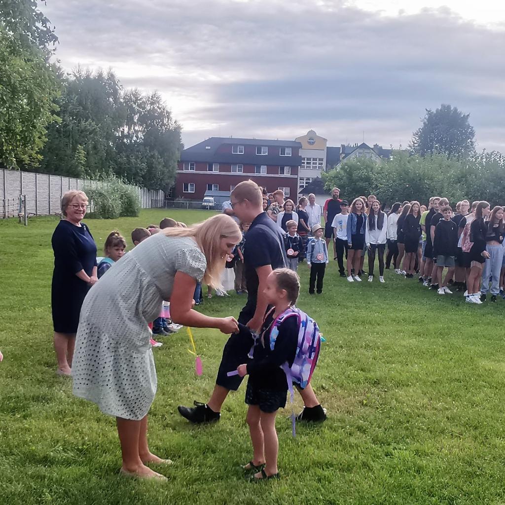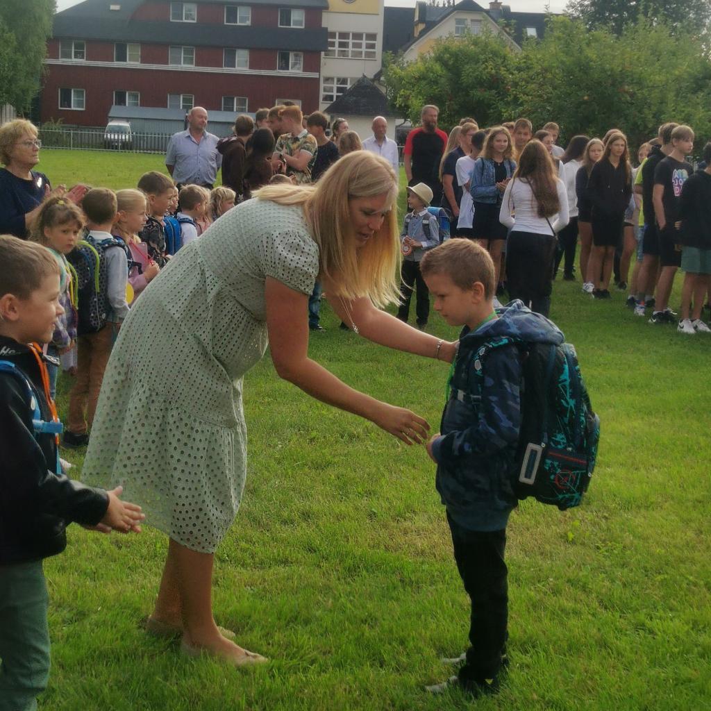 První školní den přivítal žáky krásným slunečným počasím a vypadalo to, že se někteří do školy i těší ... Pro prvňáčky si před hlavní vchod přišly třídní učitelky Iveta Petríková (1.A) a Klára Mičundová (1.B) a na školní zahradě si je seřadily tak, aby je mohli pyšní a dojatí rodiče i prarodiče sledovat při jejich prvních krůčcích za vzděláním ... Po projevu pana ředitele se každého prvňáčka ujal někdo z těch nejstarších, deváťáků, a dovedl ho k paní učitelce. Na uvítanou dostalo 36 dětí medaili a po odchodu do třídy i hezký dáreček.