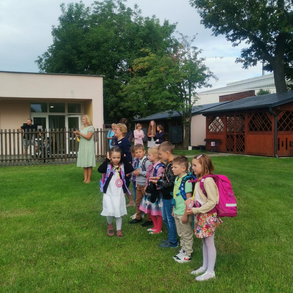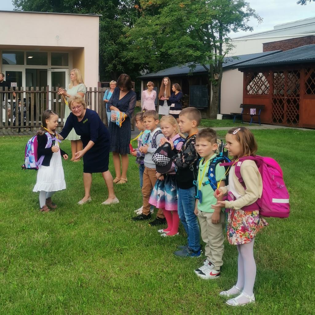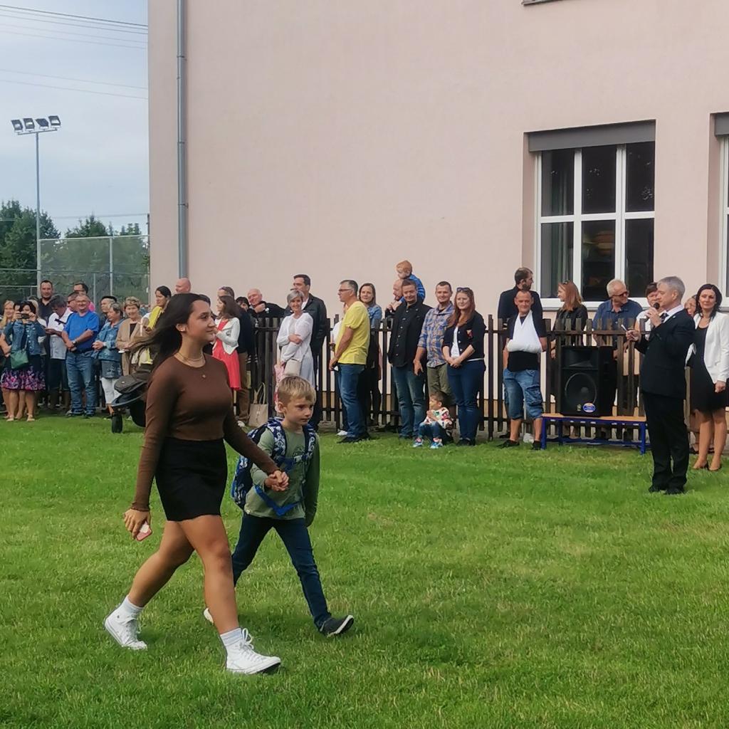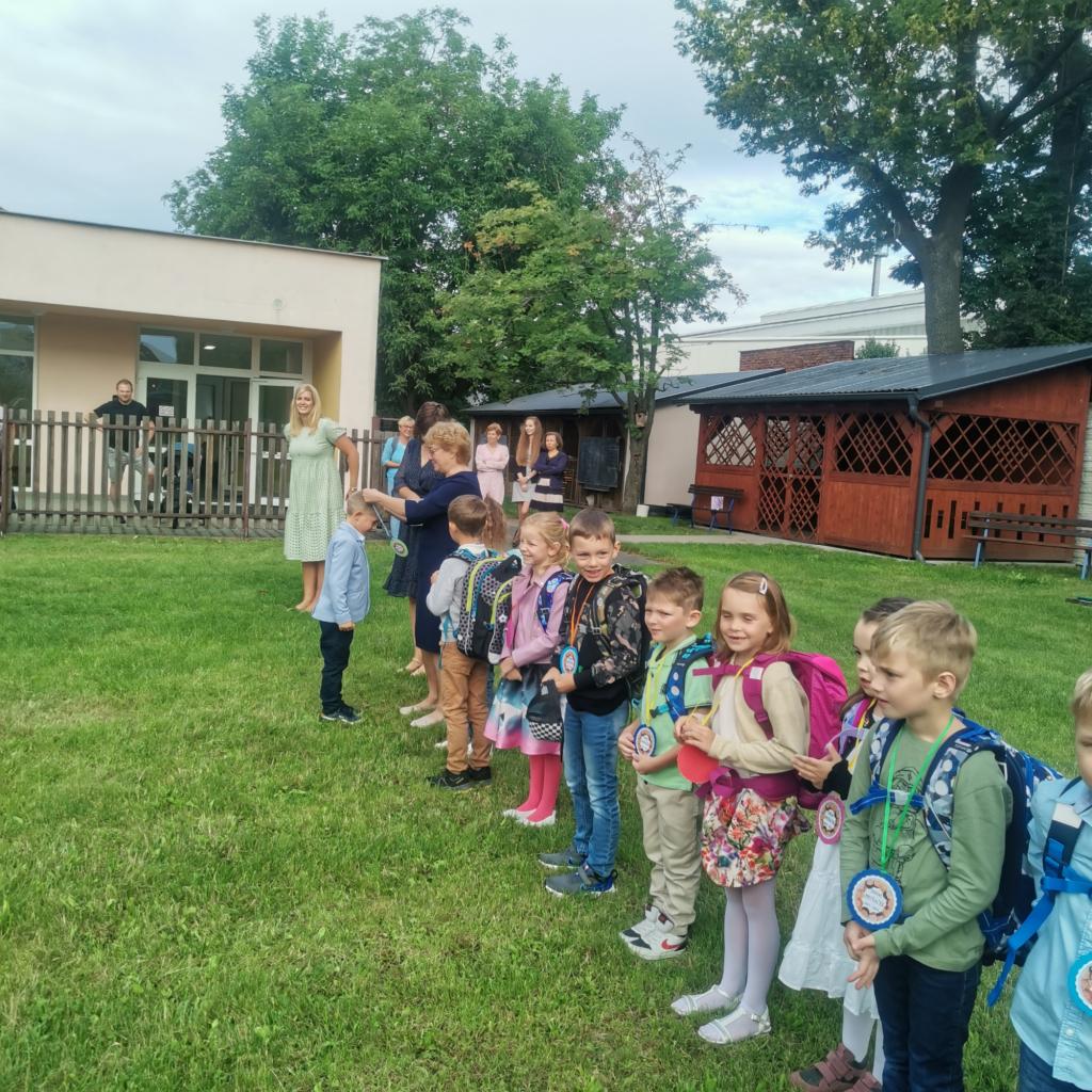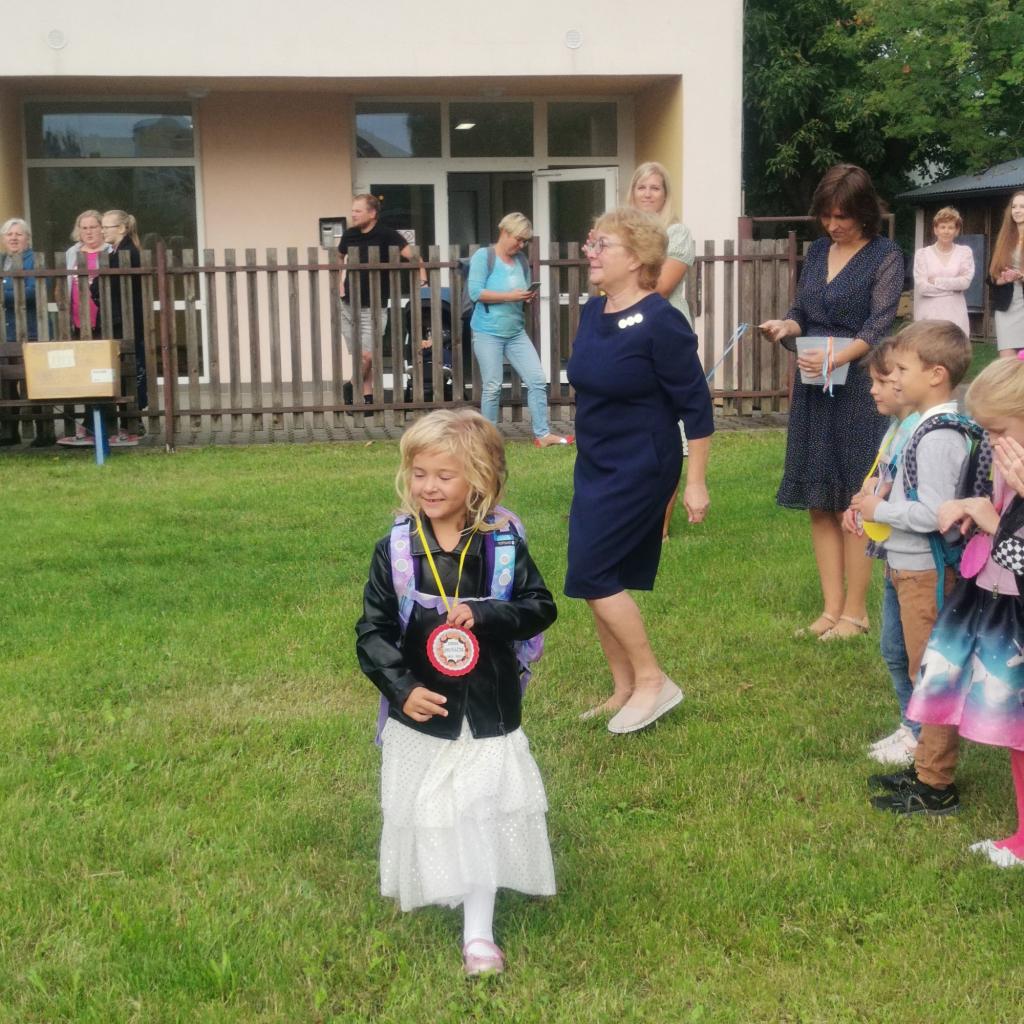 První školní den přivítal žáky krásným slunečným počasím a vypadalo to, že se někteří do školy i těší ... Pro prvňáčky si před hlavní vchod přišly třídní učitelky Iveta Petríková (1.A) a Klára Mičundová (1.B) a na školní zahradě si je seřadily tak, aby je mohli pyšní a dojatí rodiče i prarodiče sledovat při jejich prvních krůčcích za vzděláním ... Po projevu pana ředitele se každého prvňáčka ujal někdo z těch nejstarších, deváťáků, a dovedl ho k paní učitelce. Na uvítanou dostalo 36 dětí medaili a po odchodu do třídy i hezký dáreček.