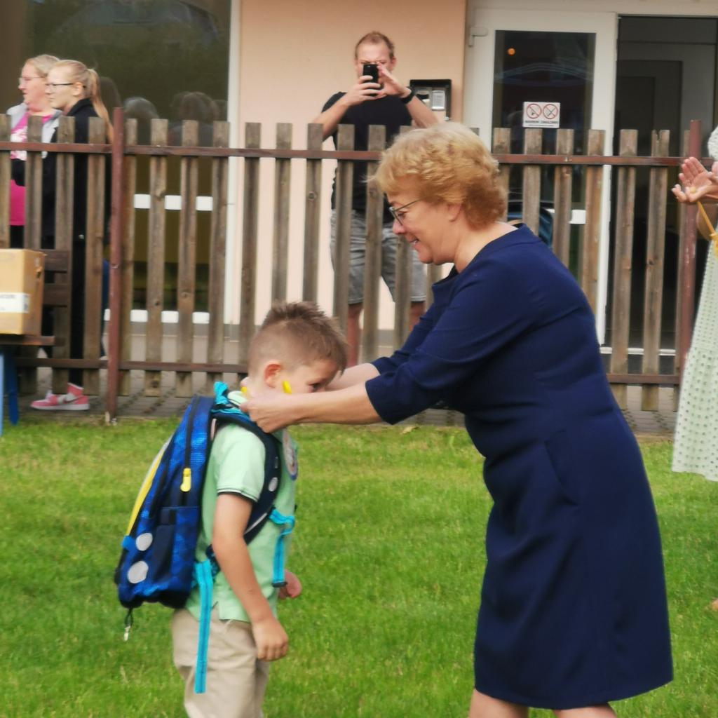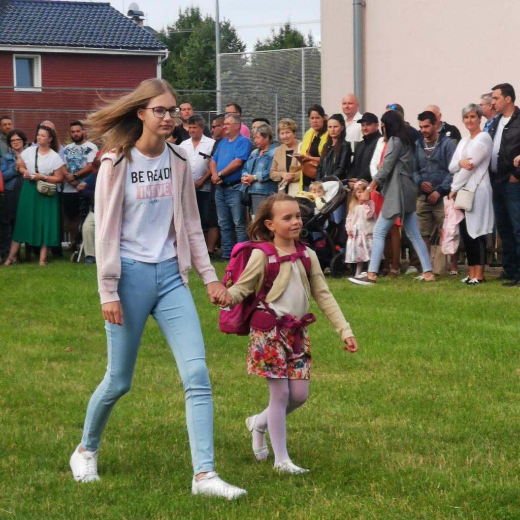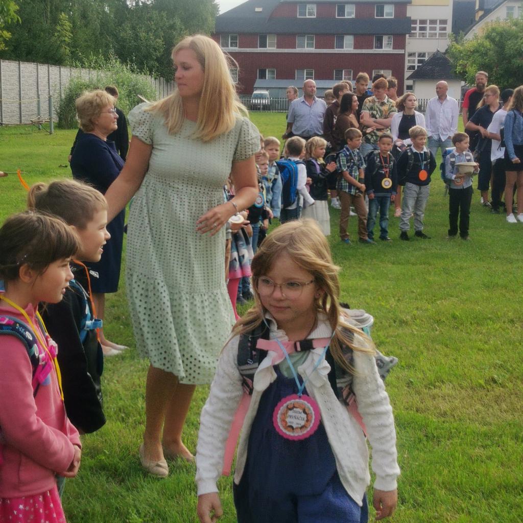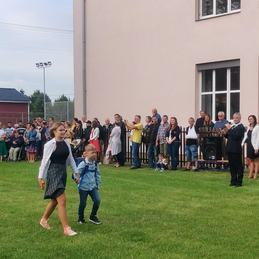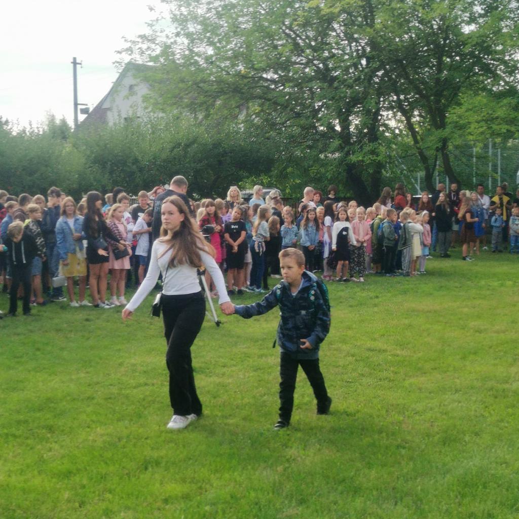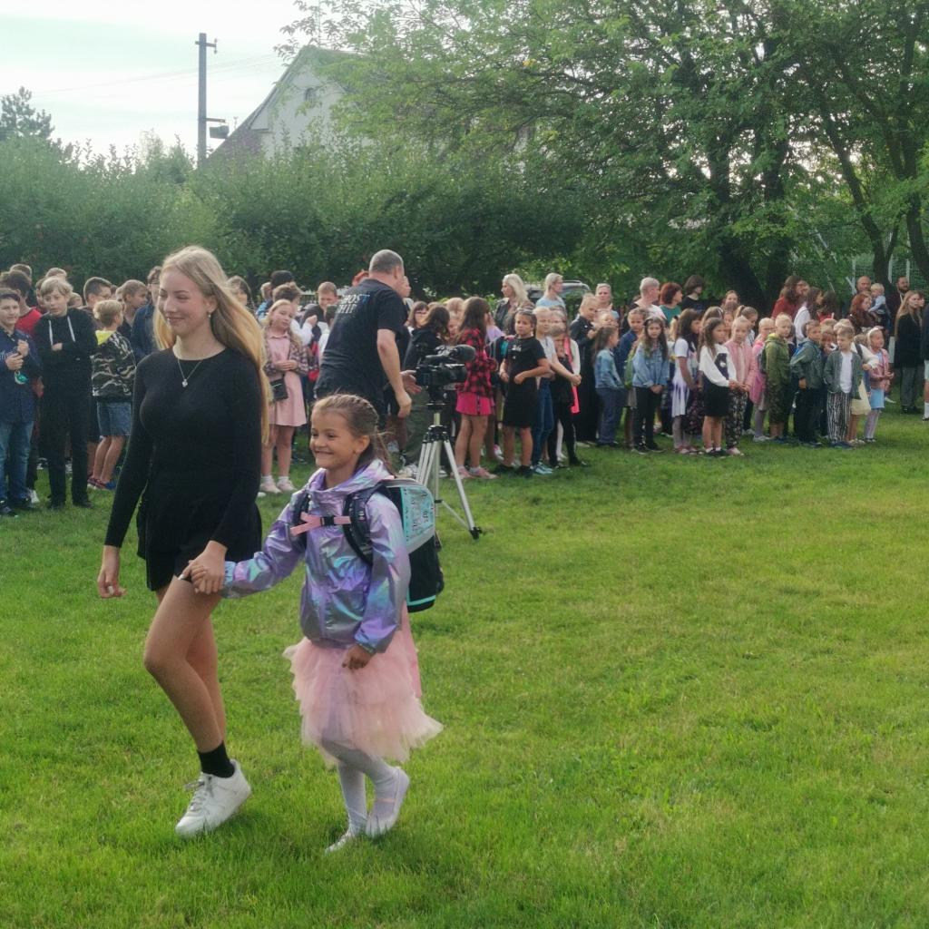 První školní den přivítal žáky krásným slunečným počasím a vypadalo to, že se někteří do školy i těší ... Pro prvňáčky si před hlavní vchod přišly třídní učitelky Iveta Petríková (1.A) a Klára Mičundová (1.B) a na školní zahradě si je seřadily tak, aby je mohli pyšní a dojatí rodiče i prarodiče sledovat při jejich prvních krůčcích za vzděláním ... Po projevu pana ředitele se každého prvňáčka ujal někdo z těch nejstarších, deváťáků, a dovedl ho k paní učitelce. Na uvítanou dostalo 36 dětí medaili a po odchodu do třídy i hezký dáreček.