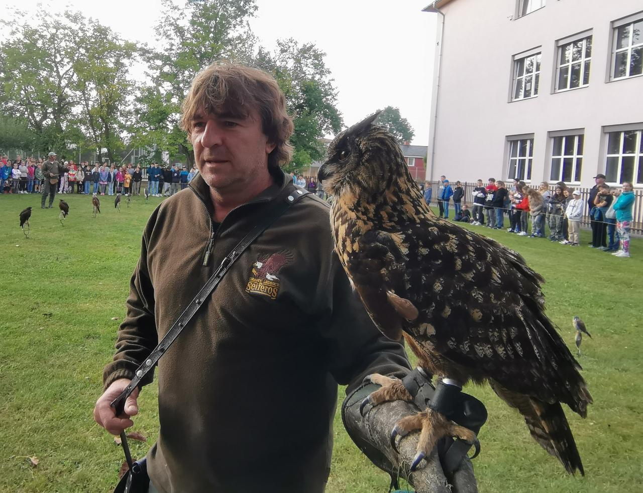 25. 9. ráno se na naši školní zahradu slétli dravci, sovy, krkavci… Ne, tohle není pohádka, ale začátek zprávy o dni, kdy nás po třech letech znovu navštívili sokolníci ze společnosti Seiferos se svou ptačí kolekcí. Program byl nabitý nejen ukázkami několika vzácných i méně unikátních druhů dravců a sov, ale také spoustou užitečných informací o ohrožení a možnostech ochrany ptactva. Je velmi smutné, že vlivem činnosti člověka ptáci z české krajiny mizí. Ale naši žáci už nyní vědí, čím mohou k ochraně ptactva sami do budoucna přispět. Přednášející pak znalosti žáků prověřil několika kvízovými otázkami a čtyři výherci dostali možnost se na vybrané dravce podívat zblízka, a dokonce si je vzít na ruku - což rozhodně vyžaduje dávku odvahy. A co jsme vlastně viděli? Třeba opravdu maličkou sovičku, kulíška nejmenšího, nebo naopak největšího a nejtěžšího dravce, supa bělohlavého. Nechyběl ani vzácný orel královský. Naši největší sovu, výra velkého, jsme pozorovali přímo v akci, když se pokoušel ulovit kunu (přesněji atrapu). Byla to zkrátka nezapomenutelná podívaná!