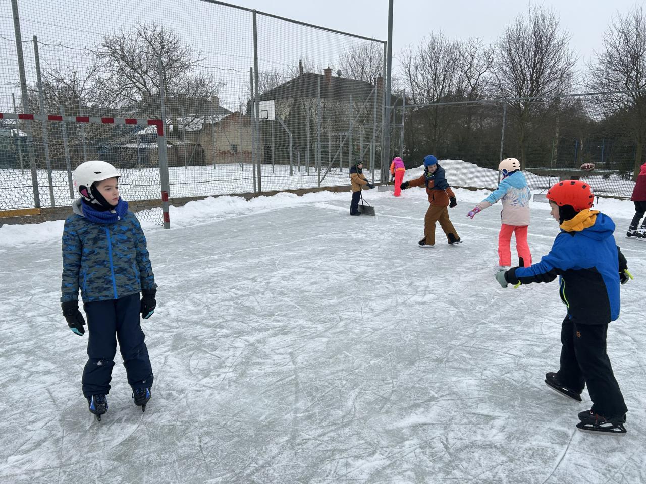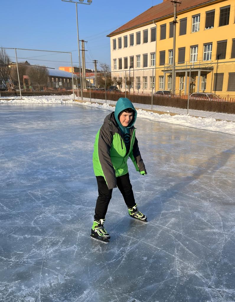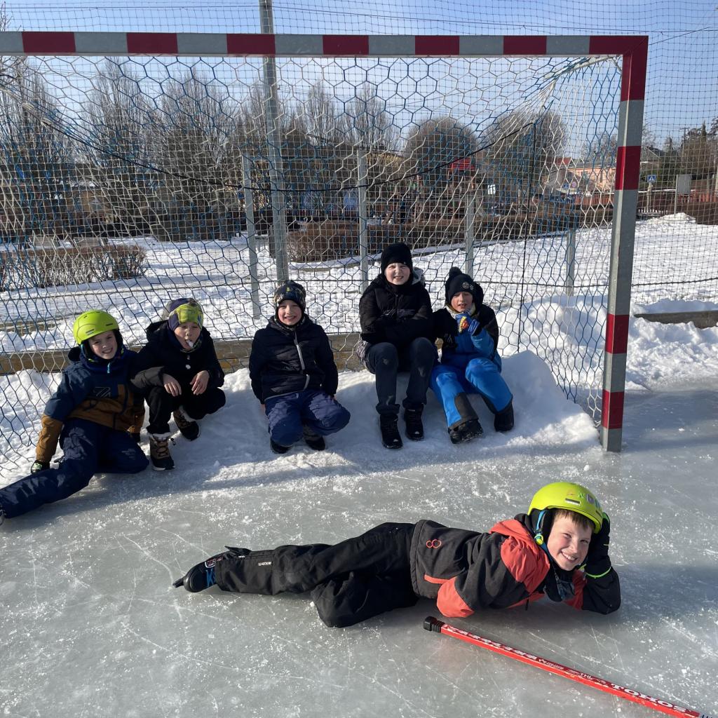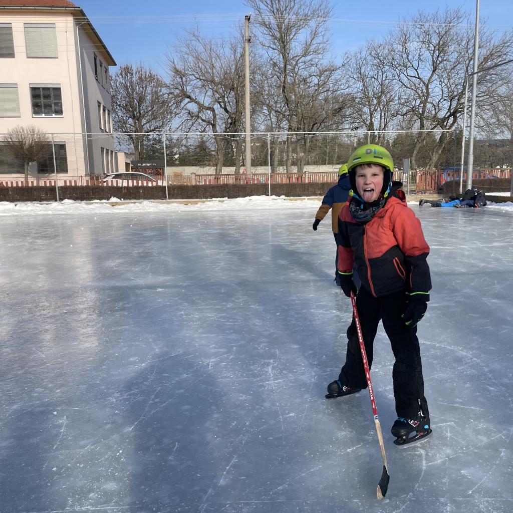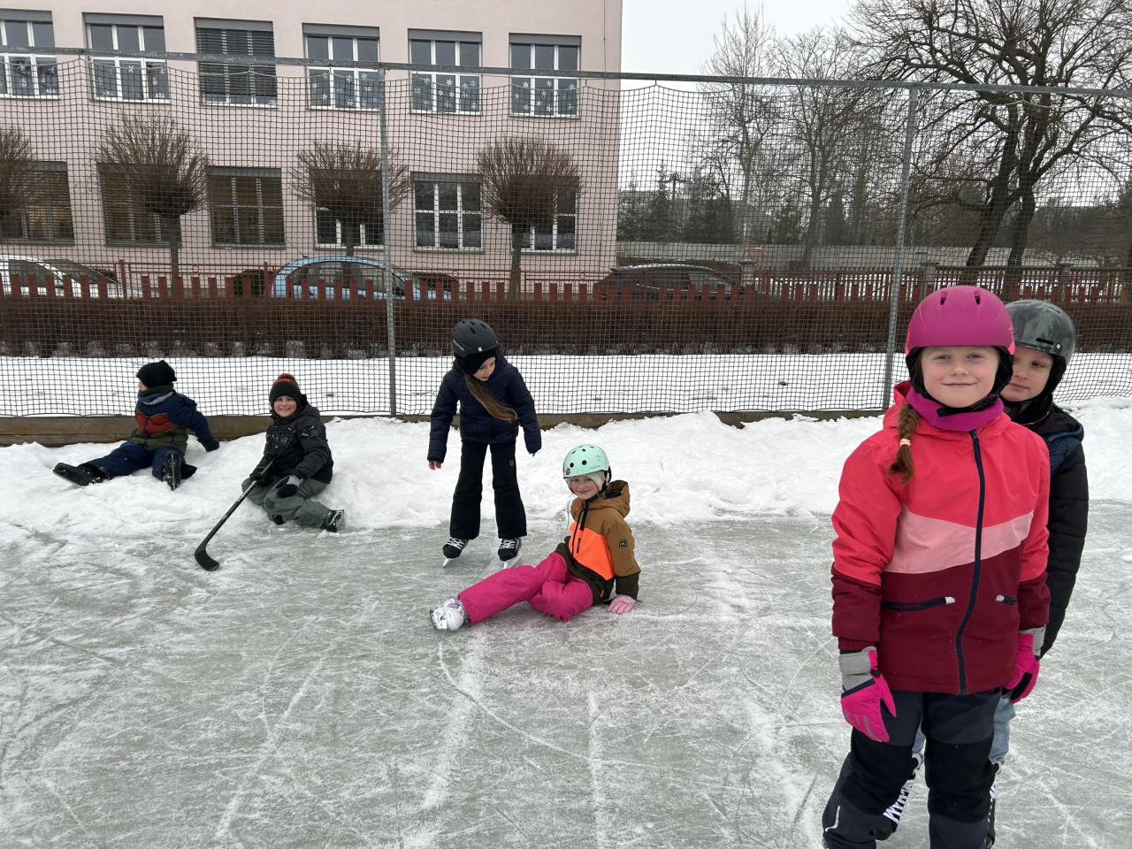 Školní hřiště se díky mrazivému počasí a péči místní obce proměnilo ve velkou ledovou plochu, která přímo vybízela k bruslení. Této jedinečné příležitosti hojně využívali žáci z celé školy, především v rámci hodin tělesné výchovy. Nechyběl smích, radost z pohybu, drobné pády, o první nejisté krůčky na ledě se pokoušeli i úplní začátečníci. Zimní období dětem přineslo nejen nadšení z pobytu na čerstvém vzduchu, ale také nevšední sportovní zážitek!