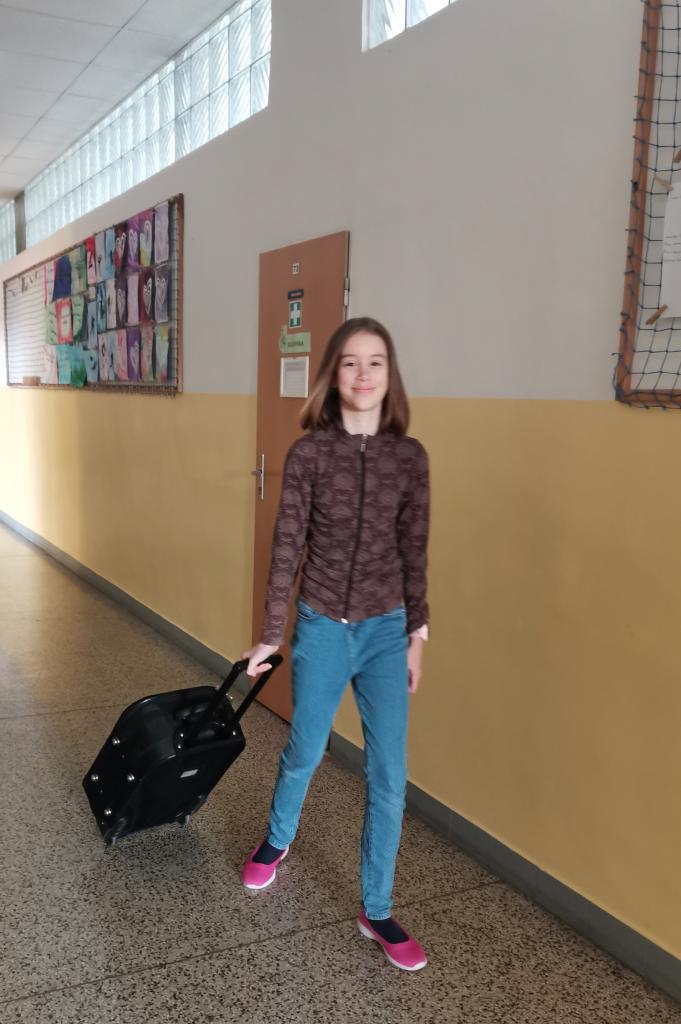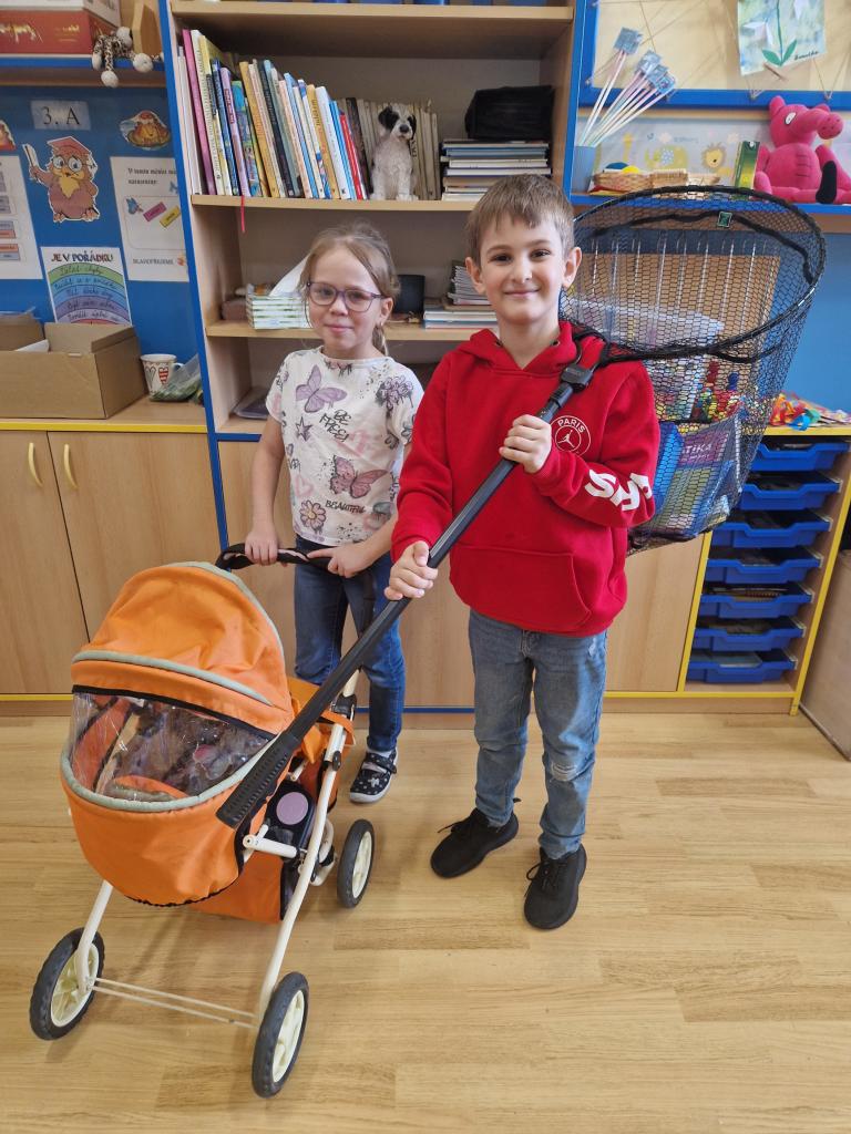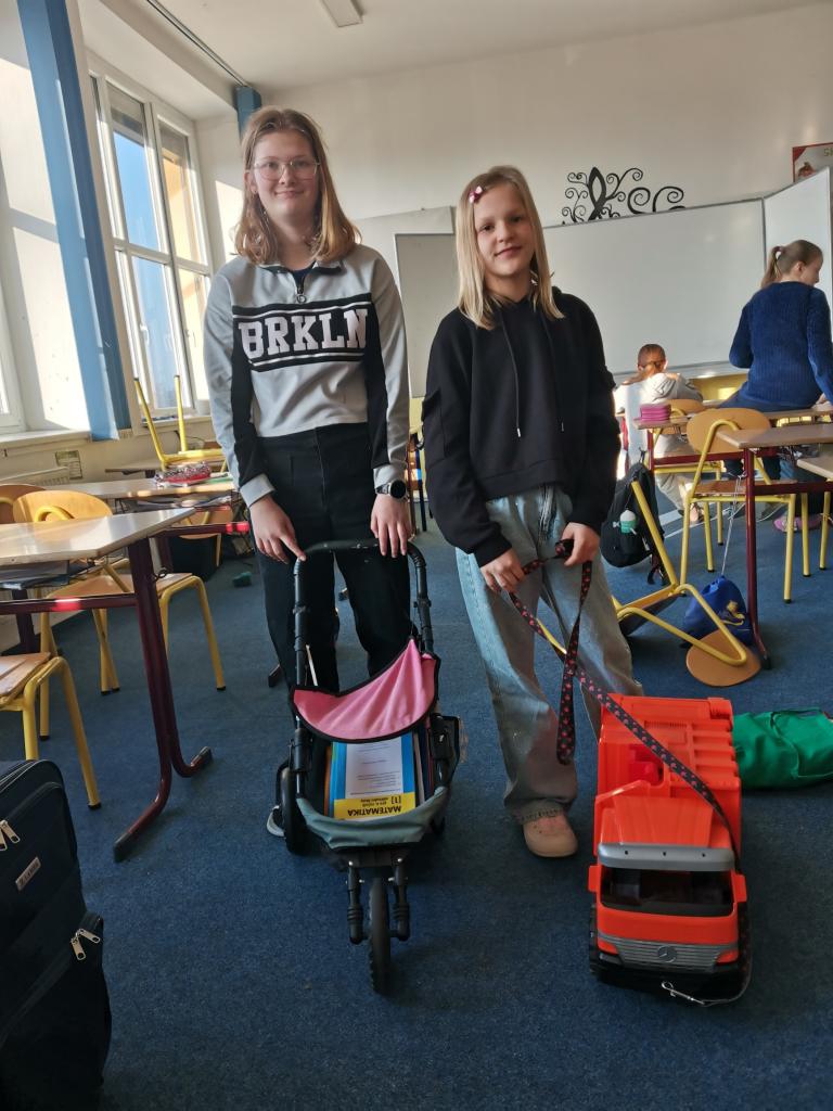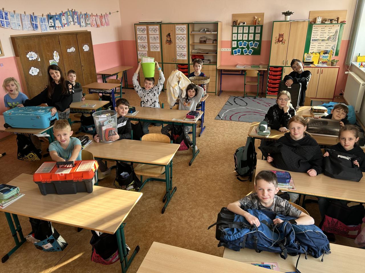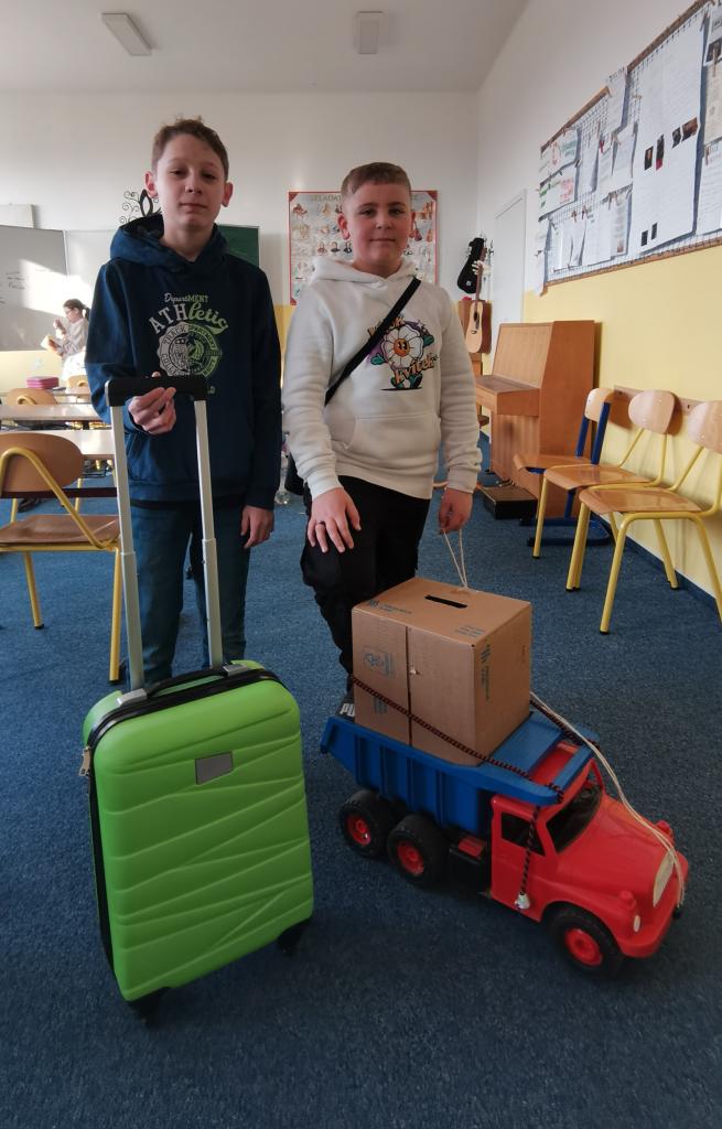 Uličky mezi lavicemi se už v pondělí zaplnily kyblíky, truhlíky, šuplíky, kočárky, odpadkovými koši, proutěnými košíky, pouzdry na hudební nástroje, přepravkami pro domácí mazlíčky… fantazii se meze opravdu nekladly. Mezi kufry různých velikostí jsme si chvílemi připadali spíš jako na letišti. Ve 2. patře o přestávkách vyjížděly na chodbu dětské náklaďáky a traktory.