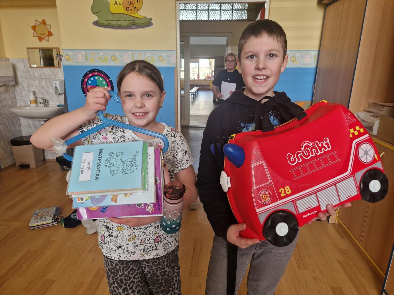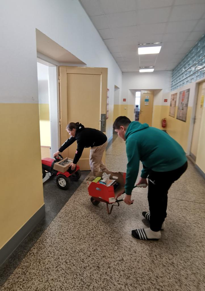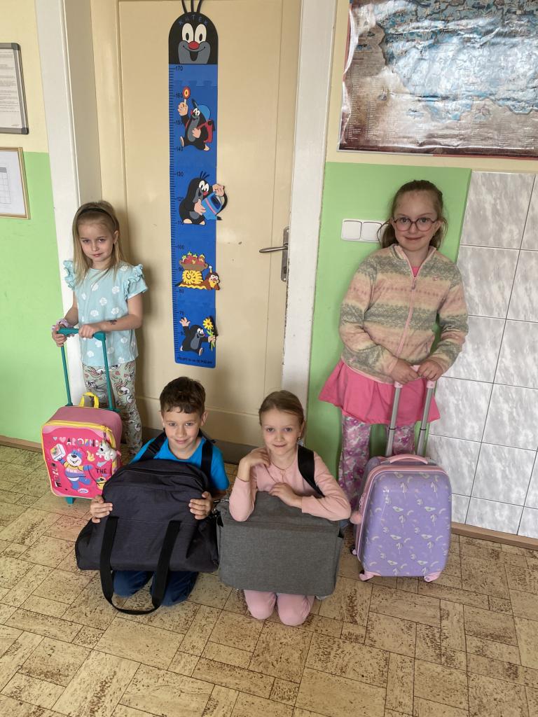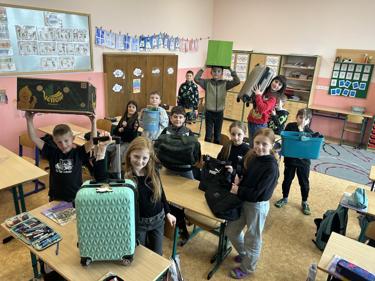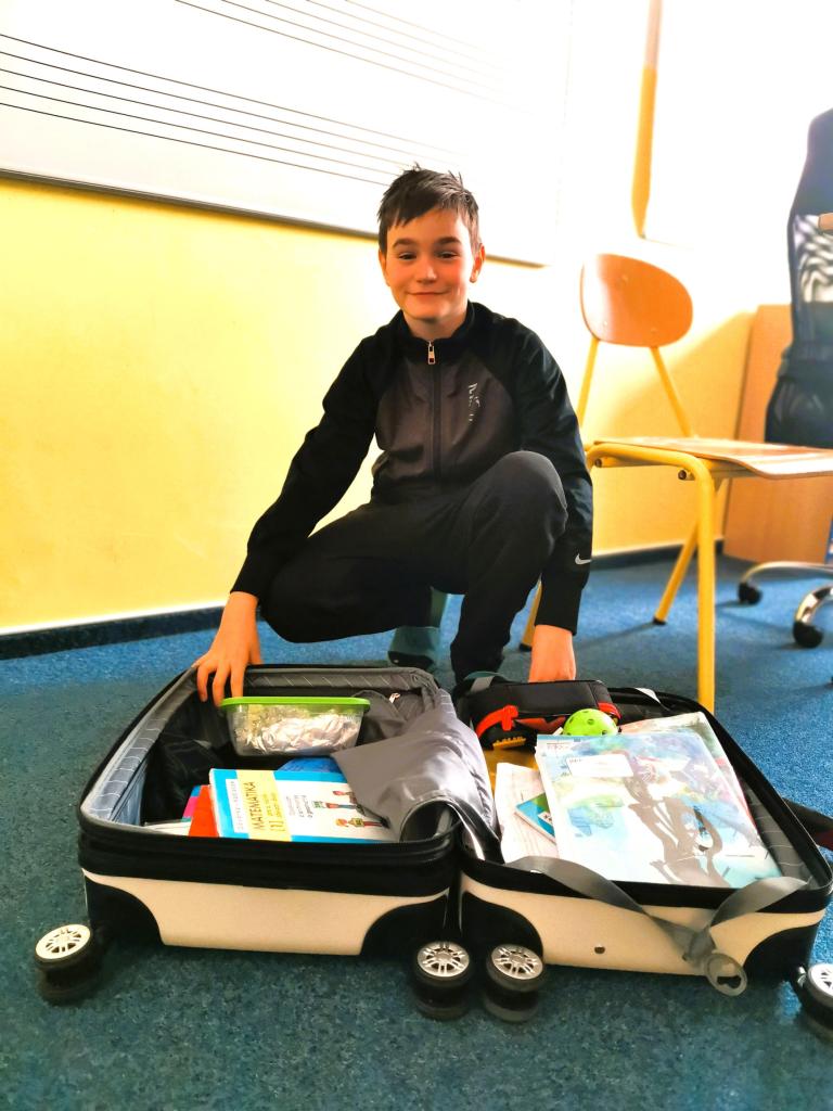 Uličky mezi lavicemi se už v pondělí zaplnily kyblíky, truhlíky, šuplíky, kočárky, odpadkovými koši, proutěnými košíky, pouzdry na hudební nástroje, přepravkami pro domácí mazlíčky… fantazii se meze opravdu nekladly. Mezi kufry různých velikostí jsme si chvílemi připadali spíš jako na letišti. Ve 2. patře o přestávkách vyjížděly na chodbu dětské náklaďáky a traktory.