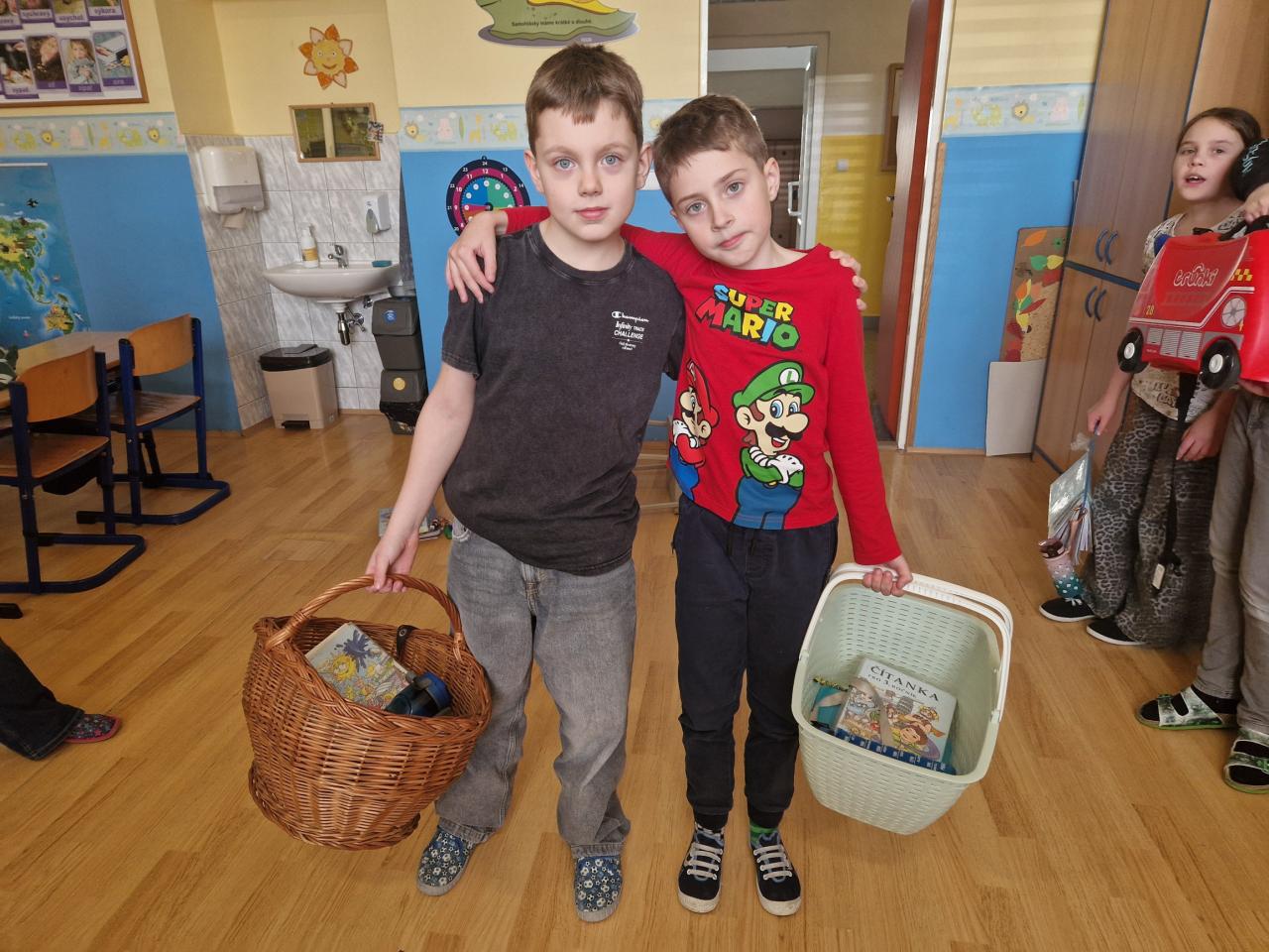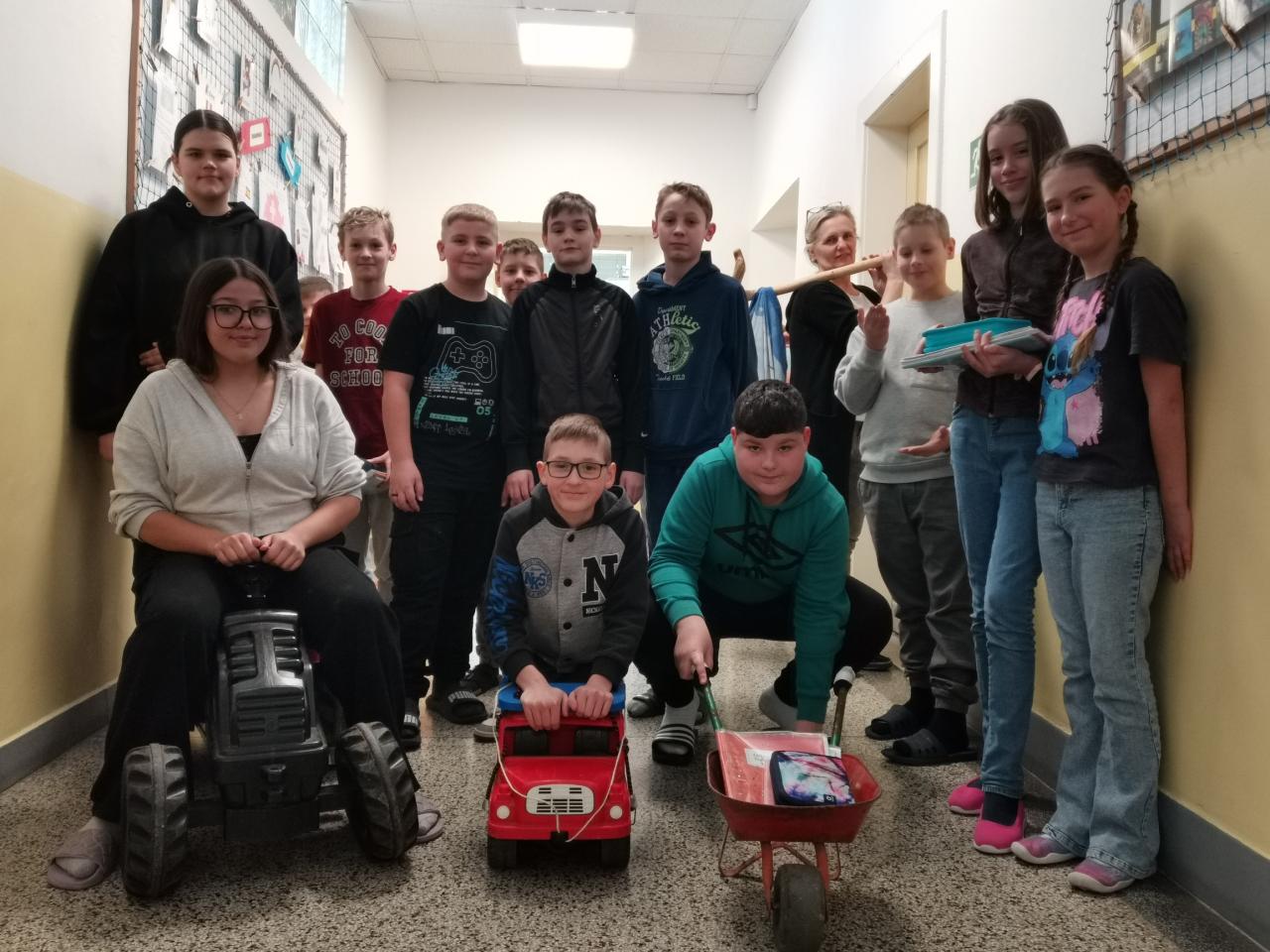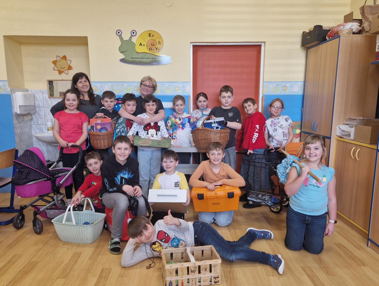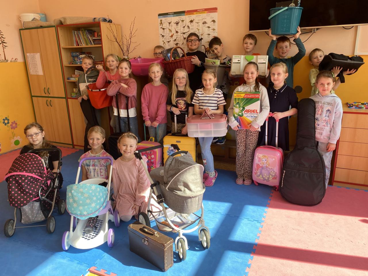 Uličky mezi lavicemi se už v pondělí zaplnily kyblíky, truhlíky, šuplíky, kočárky, odpadkovými koši, proutěnými košíky, pouzdry na hudební nástroje, přepravkami pro domácí mazlíčky… fantazii se meze opravdu nekladly. Mezi kufry různých velikostí jsme si chvílemi připadali spíš jako na letišti. Ve 2. patře o přestávkách vyjížděly na chodbu dětské náklaďáky a traktory.