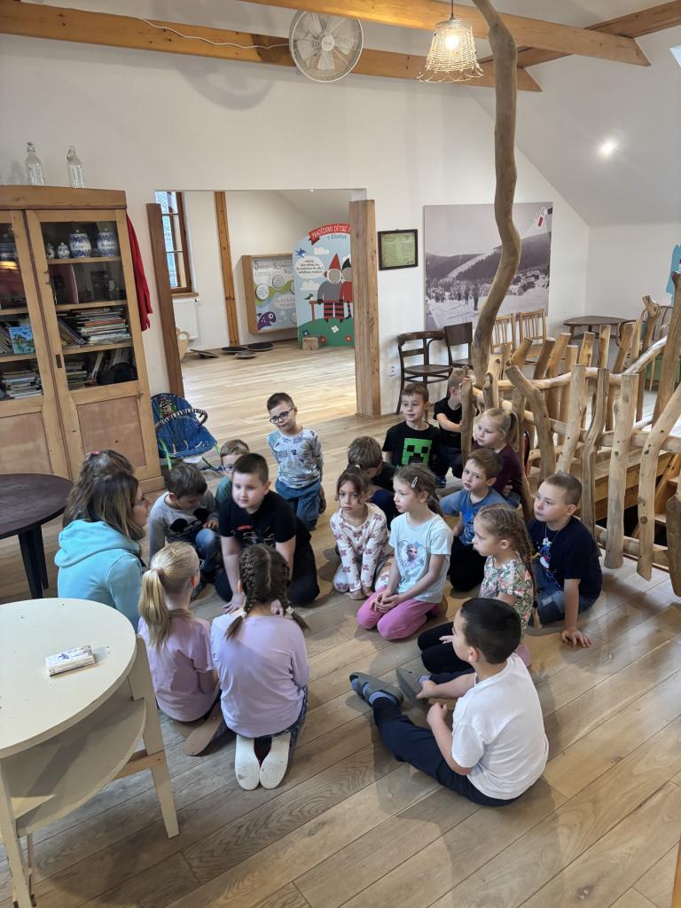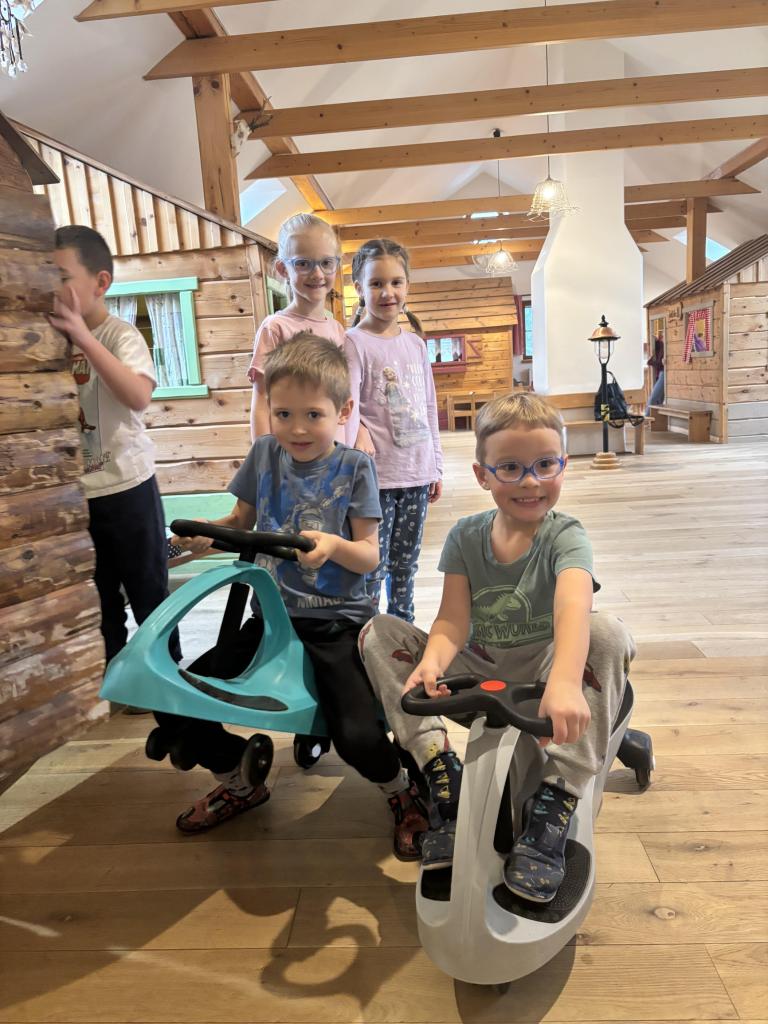 Po krátkém povídání si děti naplno užily velkou dětskou hernu, která je celá vytvořená z dřevěných prvků a nabízí spoustu možností ke hraní. Děti objevovaly různé koutky, lezly, sklouzávaly se, zkoušely interaktivní prvky a společně si hrály v přírodním prostředí plném dřeva a fantazie.